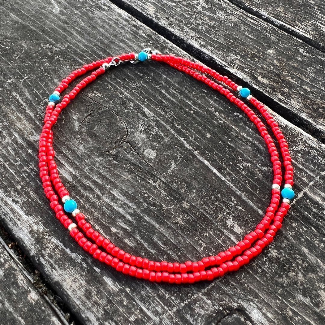 3mm 赤ビーズネックレス ターコイズストーンmix 長さ60cm