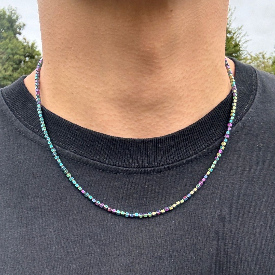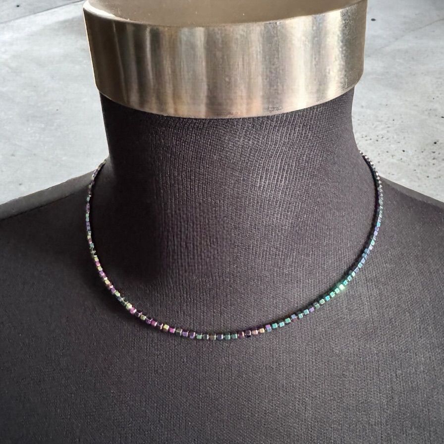ヘキサゴン(六角形)型に形成したレインボーヘマタイトを使用したビーズネックレス 。