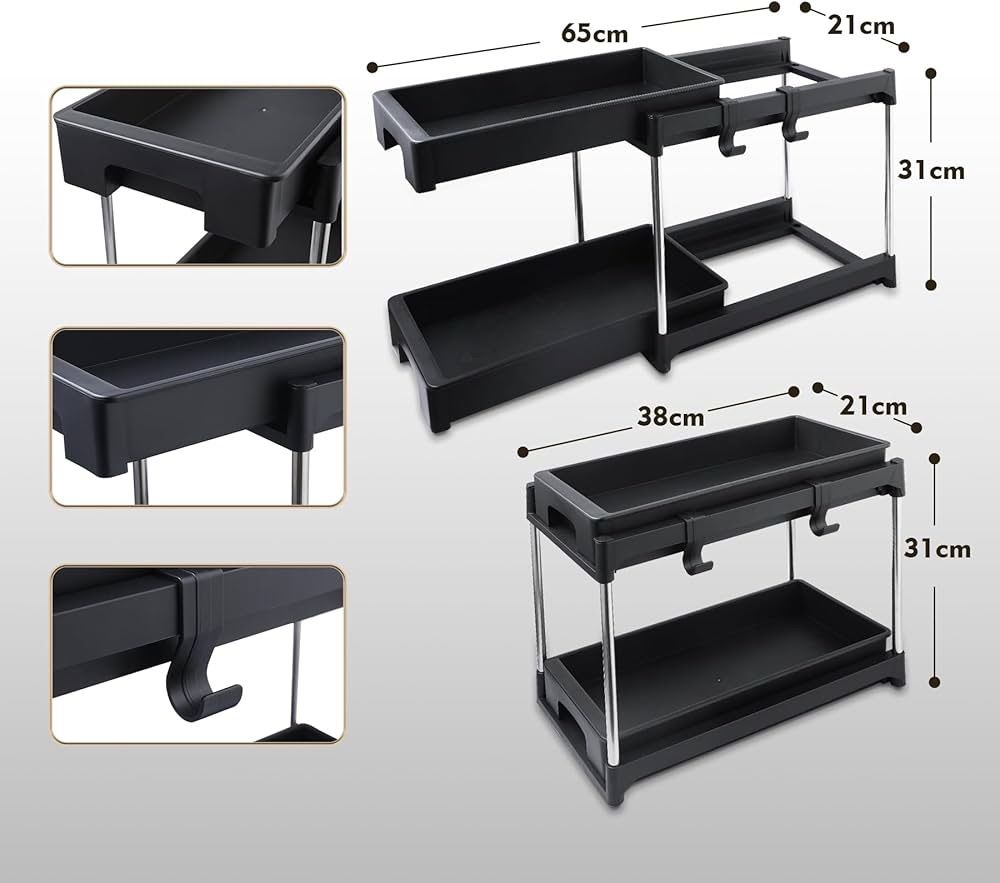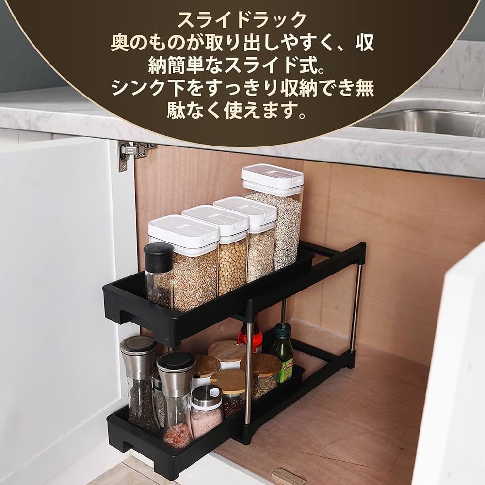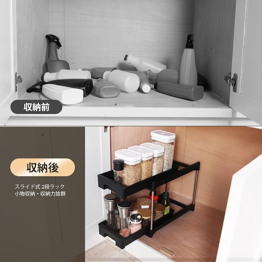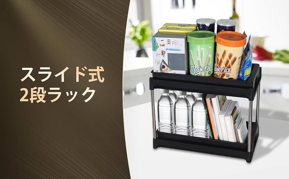 【いいデザイン】:スライド式デザインで、シンク下のスペースを有効活用した、すべりやすい収納ラックです。奥のものでも取り出しやすく、シンク下に収納できるので、無駄なく使えます。