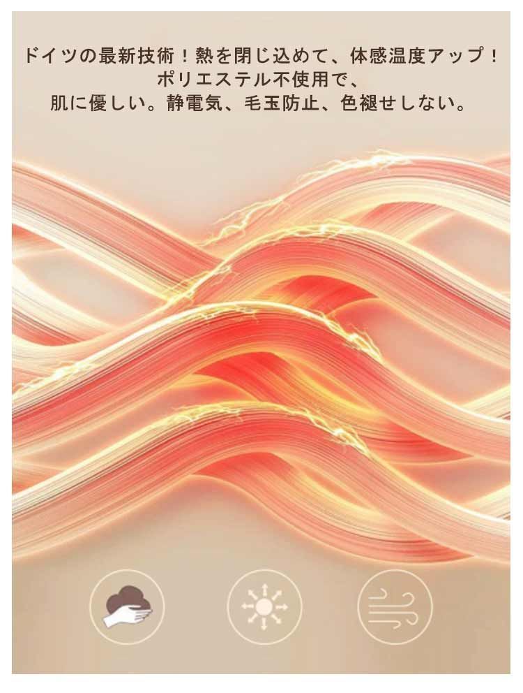 ドイツの最新技術!熱を閉じ込めて、体感温度アップ!ポリエステル不使用で、肌に優しい。静電気、毛玉防止、色褪せしない。