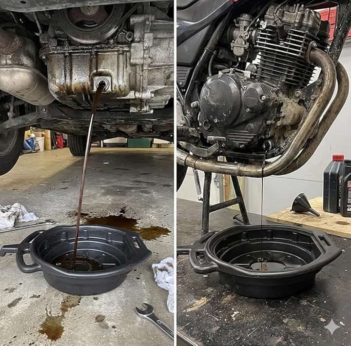 大容量で廃油をしっかり受け止め、漏斗付きで簡単にオイル交換ができます。