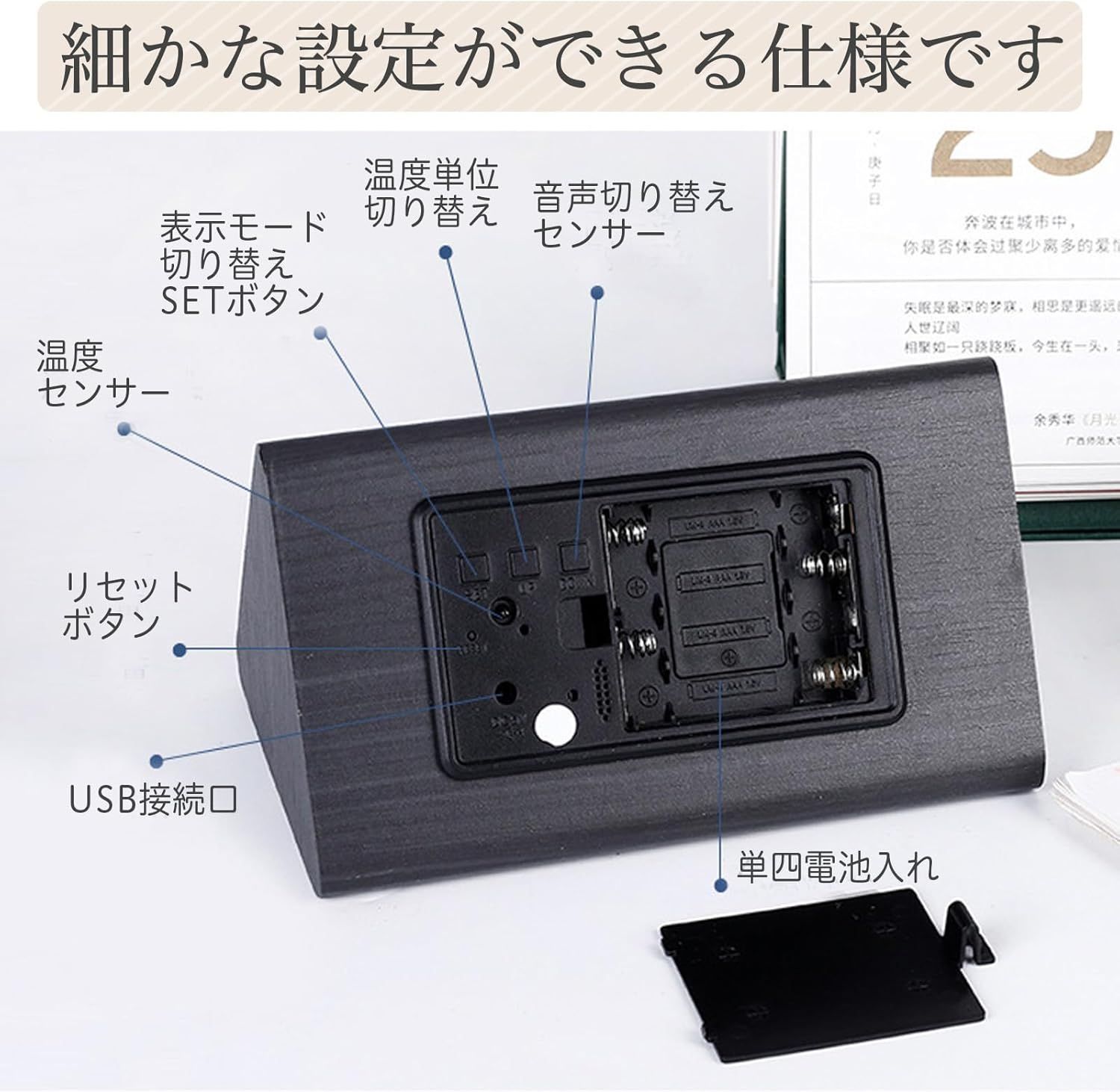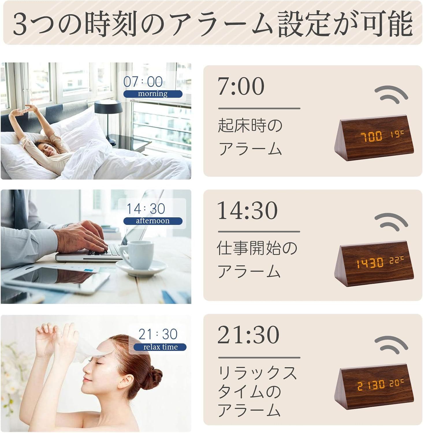 特徴アラーム, 温度表示, 湿度表示, 目覚まし時計, 自動調光可能