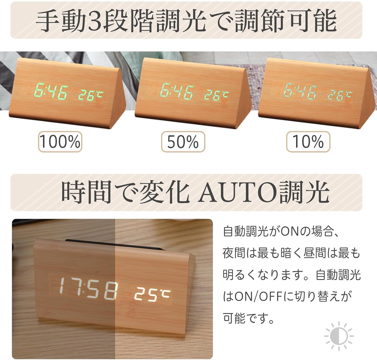 ✅【3段階の明るさ調整と自動調光機能】低から高まで明るさを三段階で調整できます。 夜に使用するのに非常に便利で、目が痛くなりません。 また、自動調光の機能をONにすると、時間帯にあわせて最適な光量を調整します。FAQ: 時計が止まったままです。 回避策: 音声に反応する音声モードをオフにします。常にオンになっています。