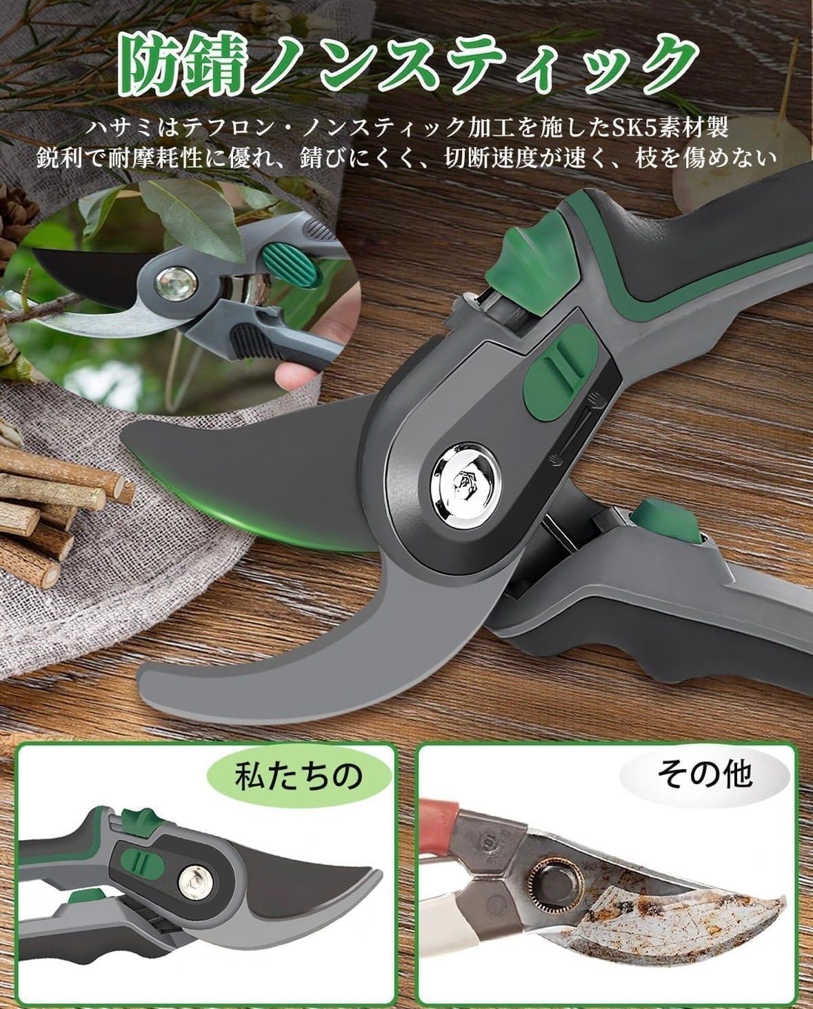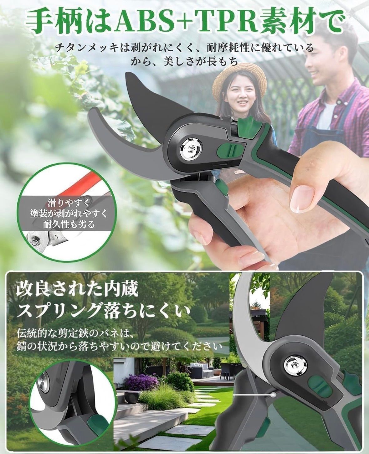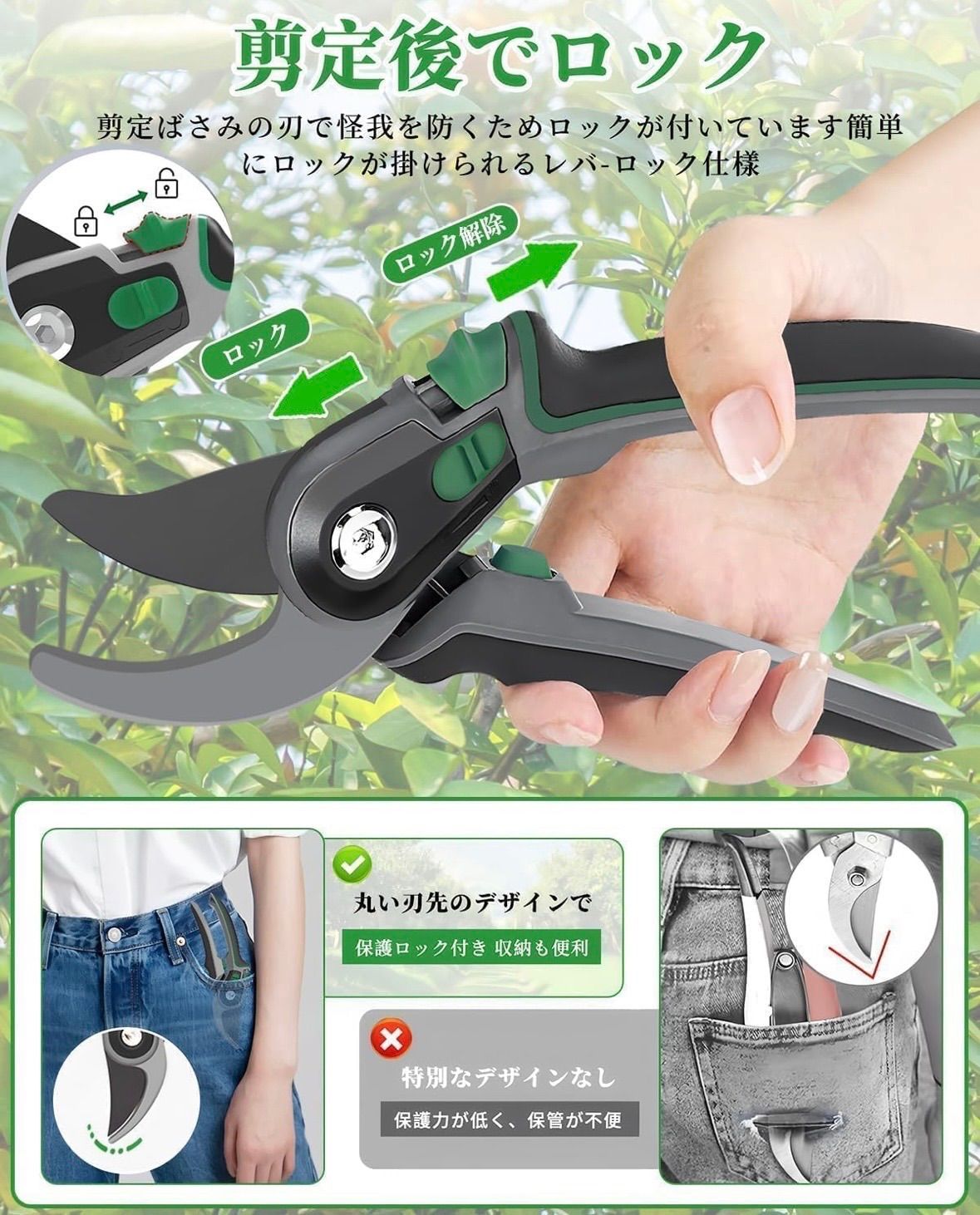 【安全ロック付き】当社の庭鋏は内蔵スプリング設計を採用しており、スプリングの脱落や剪断破壊の発生を効果的に防ぎます。安全ロックは、使用していないときにハサミが誤って開くのを効果的に防ぎ、安全を保護します。ロック設計は、怪我を避けるためにはさみを保管するのにも役立ちます。