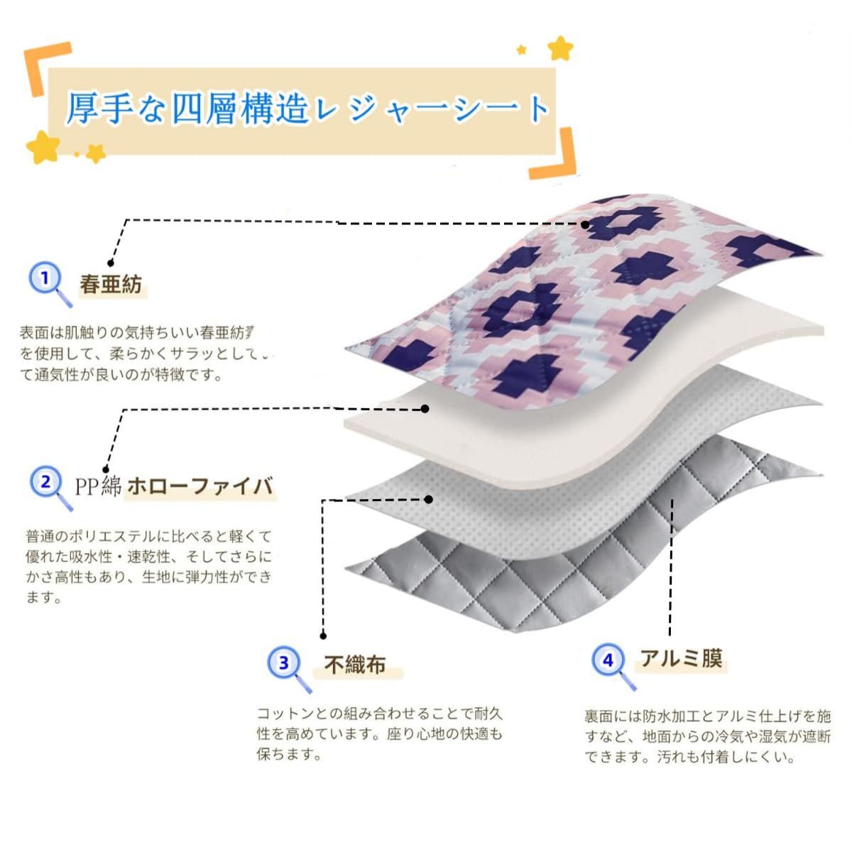?【4層構造のピクニックシート】:超音波加工のレジャーシートは4層構造で、第1層はダウンジャケットに使用される柔らかな生地で触り心地が非常に快適です。第2層には、通常のスポンジではなく、柔らかなPPコットンが使用され、小石などによる傷を防ぎ、より快適な使用感を実現します。第3層では、不織布と中間のPPコットンが密着して剥がれず、長期間使用できます。第4層では、防水撥水効果のあるアルミフィルムが底面に使用され、地面や芝生の湿気を防ぎます。底面が汚れた場合は、湿った布で拭き取ります。