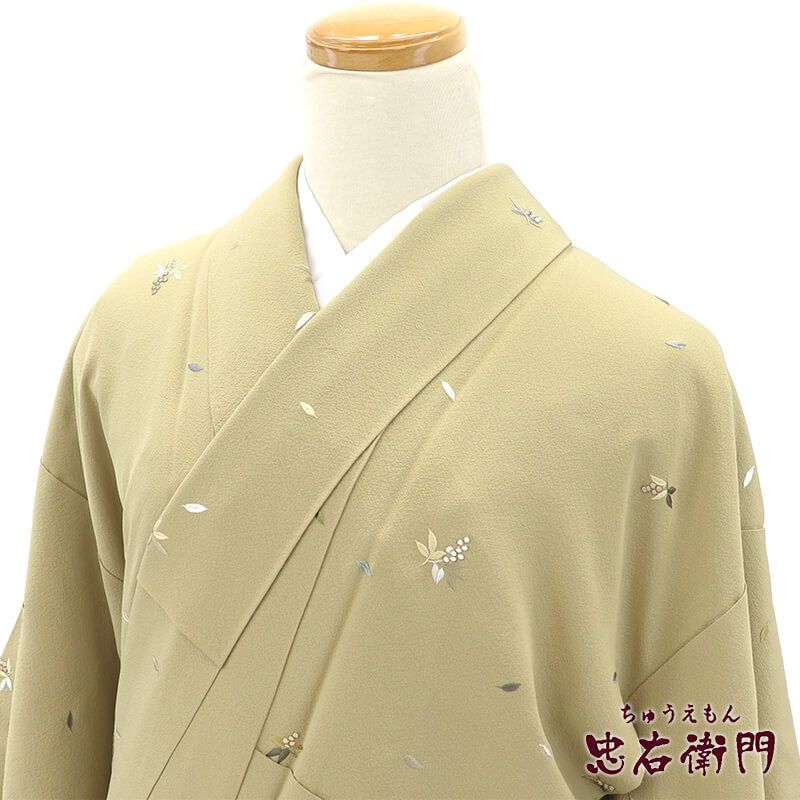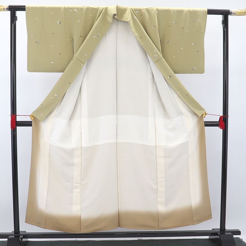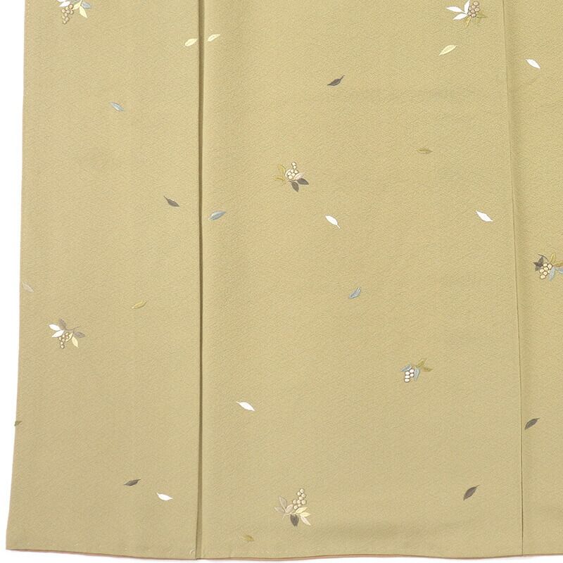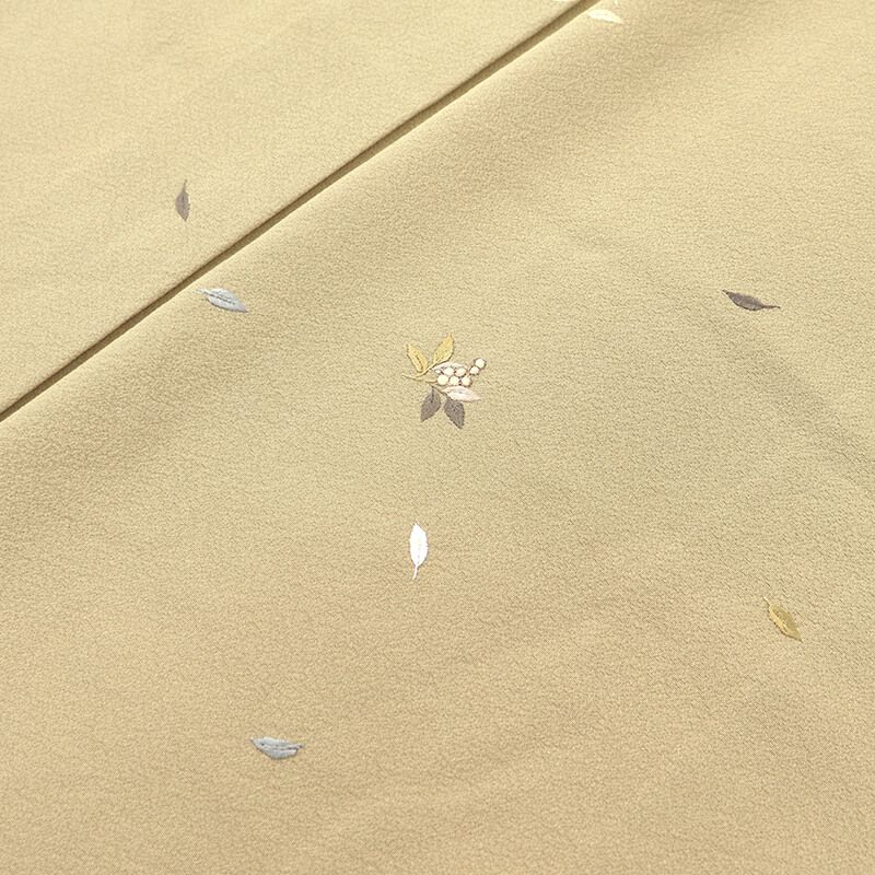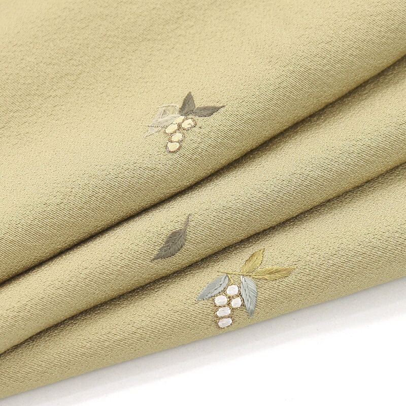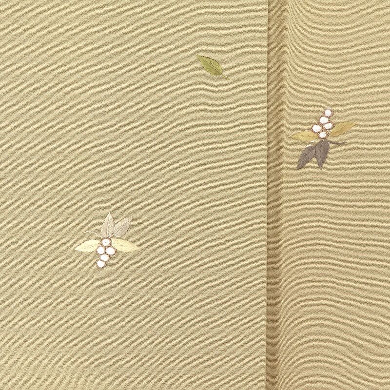 やや緑みのあるベージュに、 刺繍で飛び柄の草木が表現された小紋。 上品な品格のある雰囲気で、 刺繍には部分的に金糸が用いられております。 刺繍の光沢感が、全体の雰囲気を上質なものとしております。