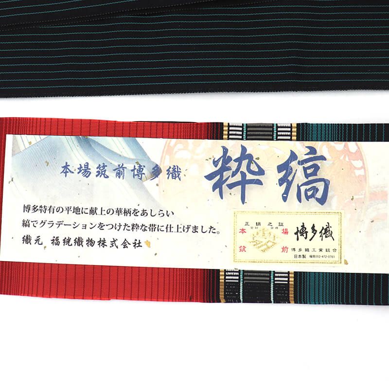 本場筑前 博多織の証紙がついております。黒、緑、朱赤、紫の色分けの博多織の名古屋帯。献上柄と縞が用いられております。色使いがどことなく、クリスマスなどを連想いたします。 華やぎ感のある色で、コーディネイトのアクセントになる帯ですね。