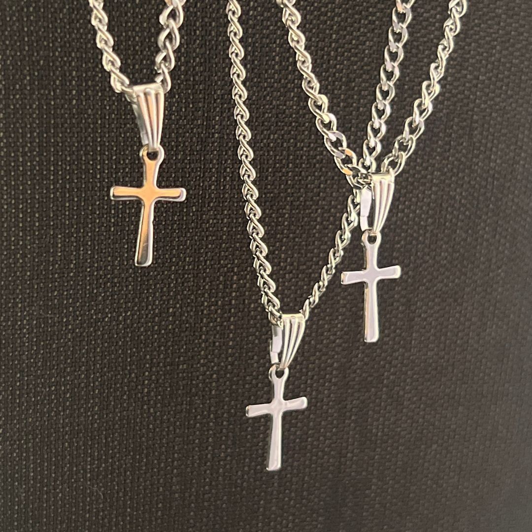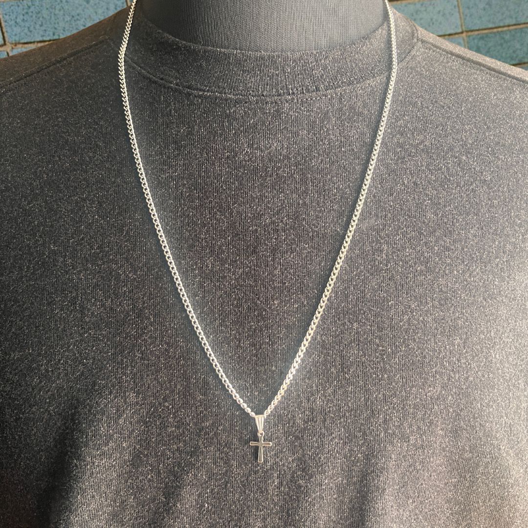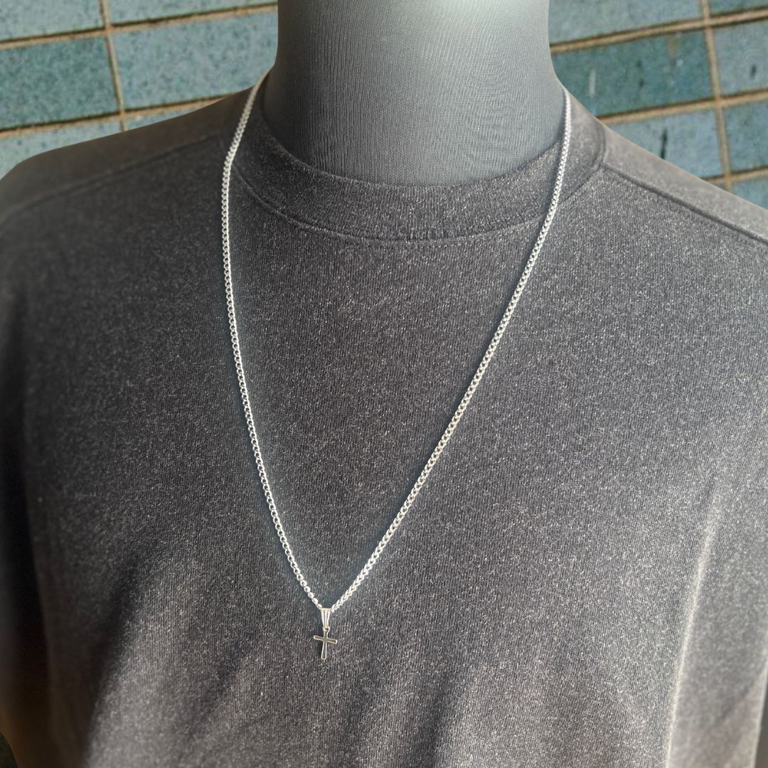 2.8mm幅のステンレス製喜平チェーンネックレスと十字架チャームを組み合わせたクロスネックレスでふ。