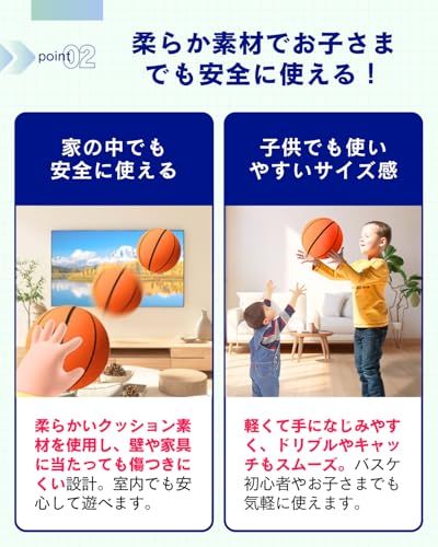 【柔らか素材で家具も安心!自宅でも安全に遊べる】クッション性の高い素材を使用しており、壁や家具に当たっても傷つけにくい構造。小学生のお子さまでも安心して使用でき、バスケットボール 小学生の入門用としてもおすすめ。親子で一緒に室内練習が楽しめます。