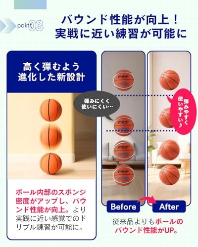 【バウンド性能が進化!よりリアルな練習が可能に】新モデルではバウンド性能が従来品よりも大幅に向上。しっかりと弾む感覚で、通常のバスケットボールに近いリアルな練習が可能。室内でも実戦に近い動きを再現でき、ドリブルやハンドリングの上達をサポートします。