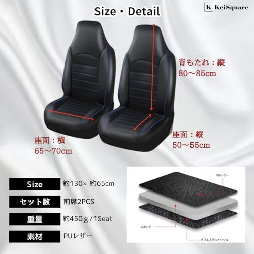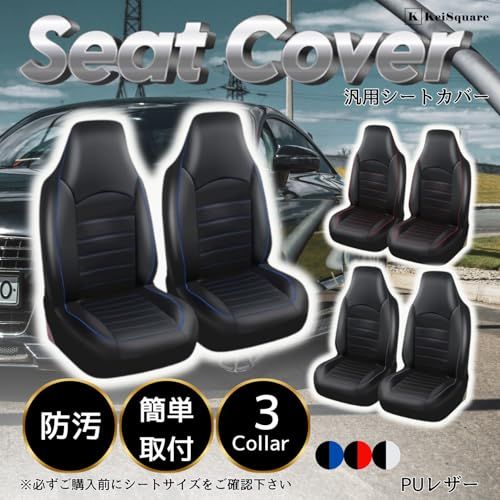 【製品仕様】ユニバーサル仕様のシートカバーになります。運転席、助手席用2席セット・サイズ:背もたれ部 縦8085cm幅48cm60 cm(位置によって異なります)※ヘッドレスト部分は少し細くなります。座席部縦5055cm幅6570cm・重量:950g・材質:PUレザー・カラー:ブラックBlueライン、ブラックRedライン、ブラックGrayラインの3色をご用意しております。