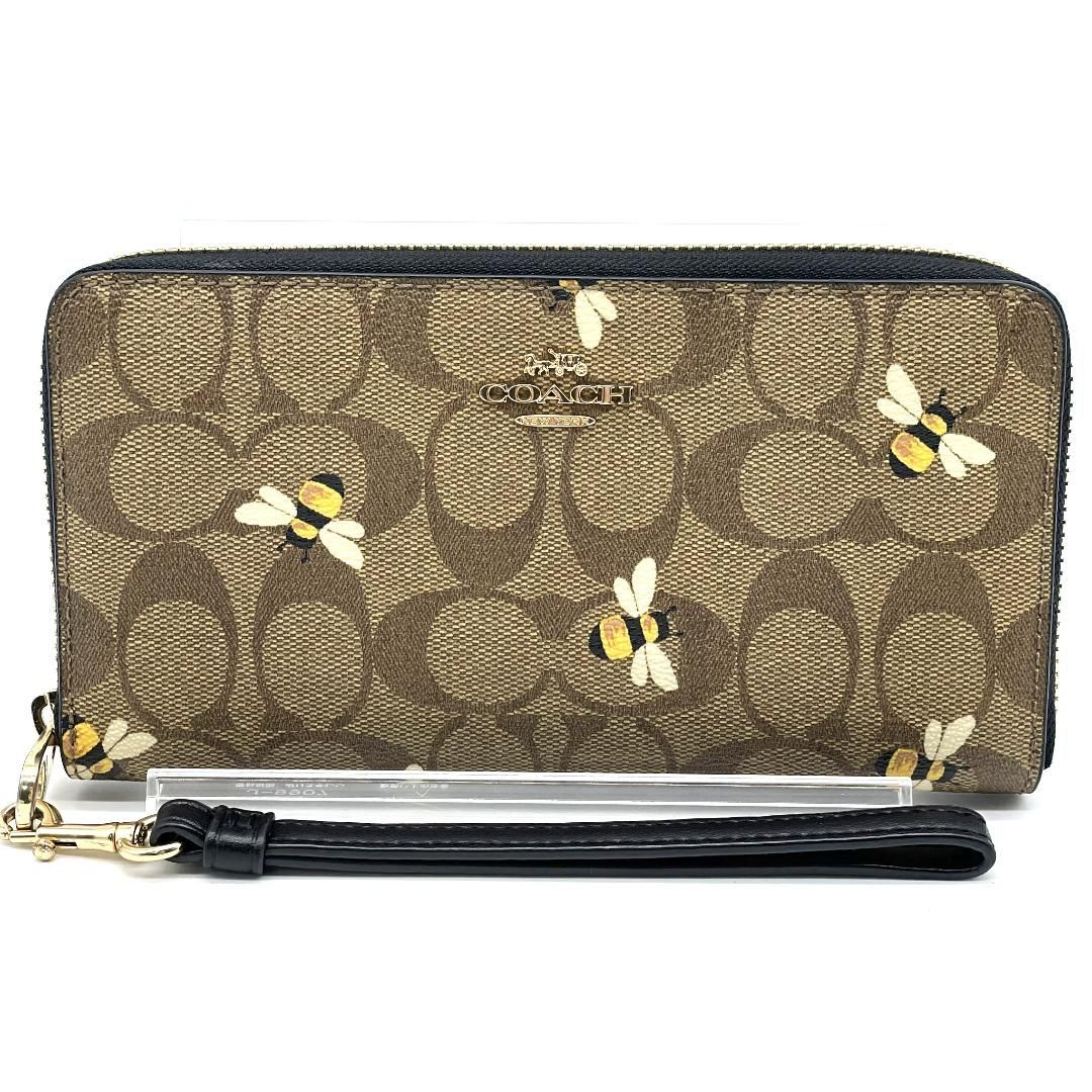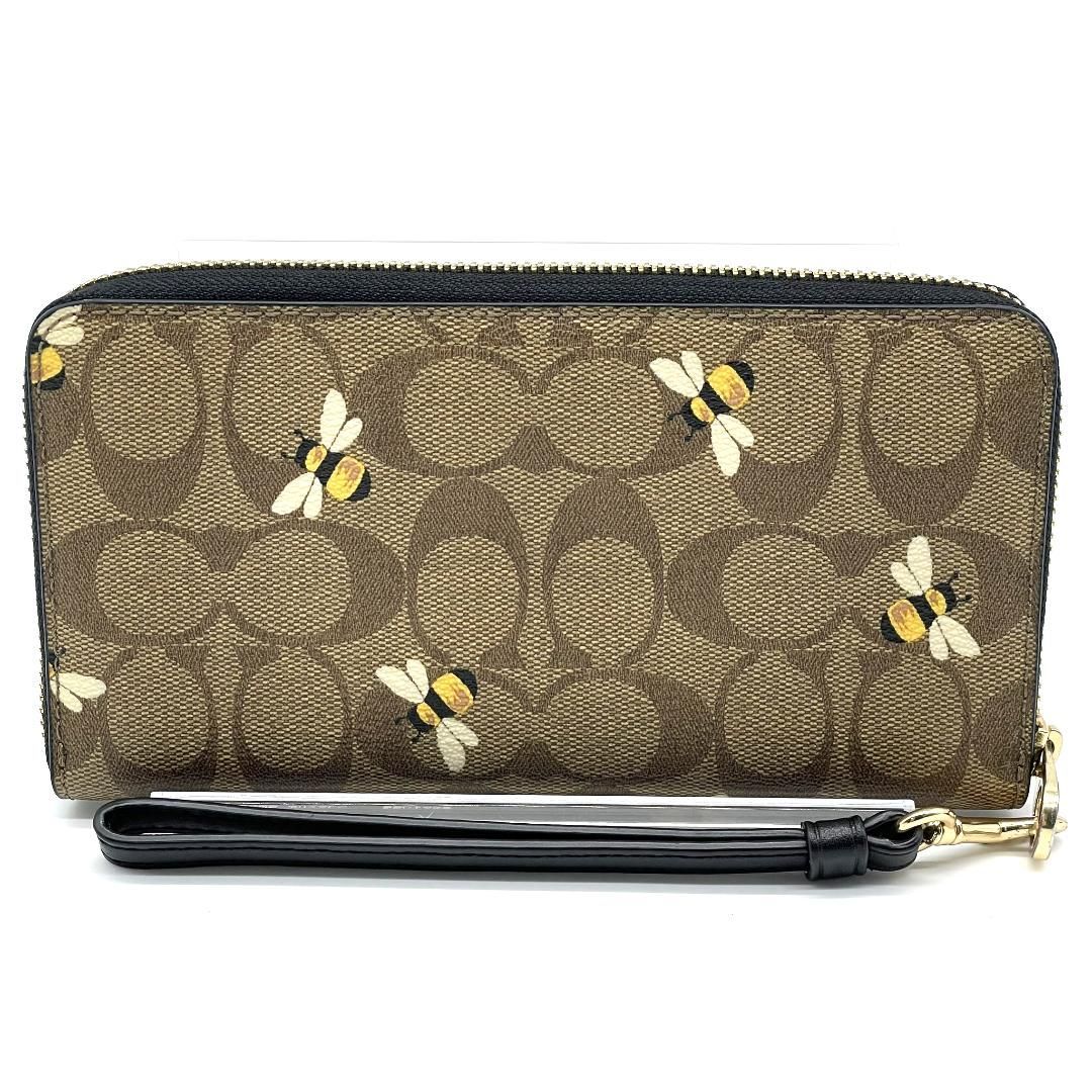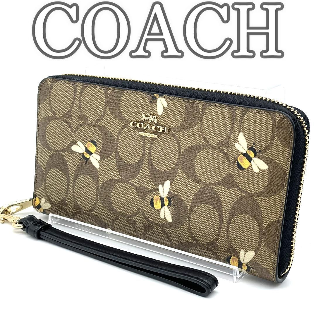 Coachのシグネチャー柄PVCを使用した長財布です。ブラウン系のシグネチャーキャンバスに蜂モチーフのプリントをあしらった、遊び心と上品さを兼ね備えたデザインが特徴です。ラウンドファスナー仕様で大きく開き、紙幣スペースやカードポケット、小銭入れを備えた収納力の高い設計となっています。取り外し可能なストラップ付きのため、クラッチ感覚での使用やバッグからの取り出しもスムーズです。ゴールドカラーの金具が全体を引き締め、日常使いからお出かけまで幅広いシーンで活躍する実用性とデザイン性を兼ね備えたアイテムです。