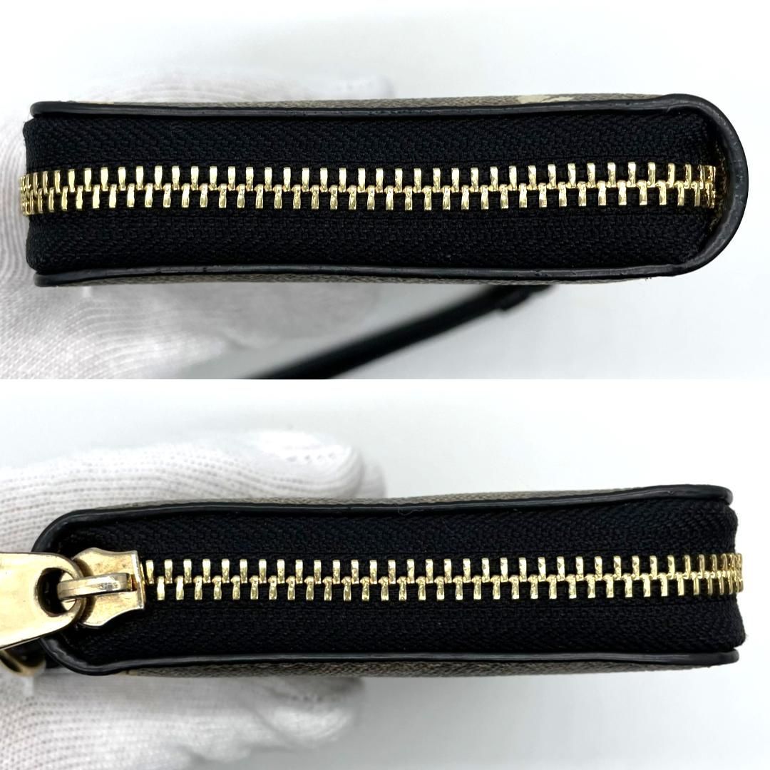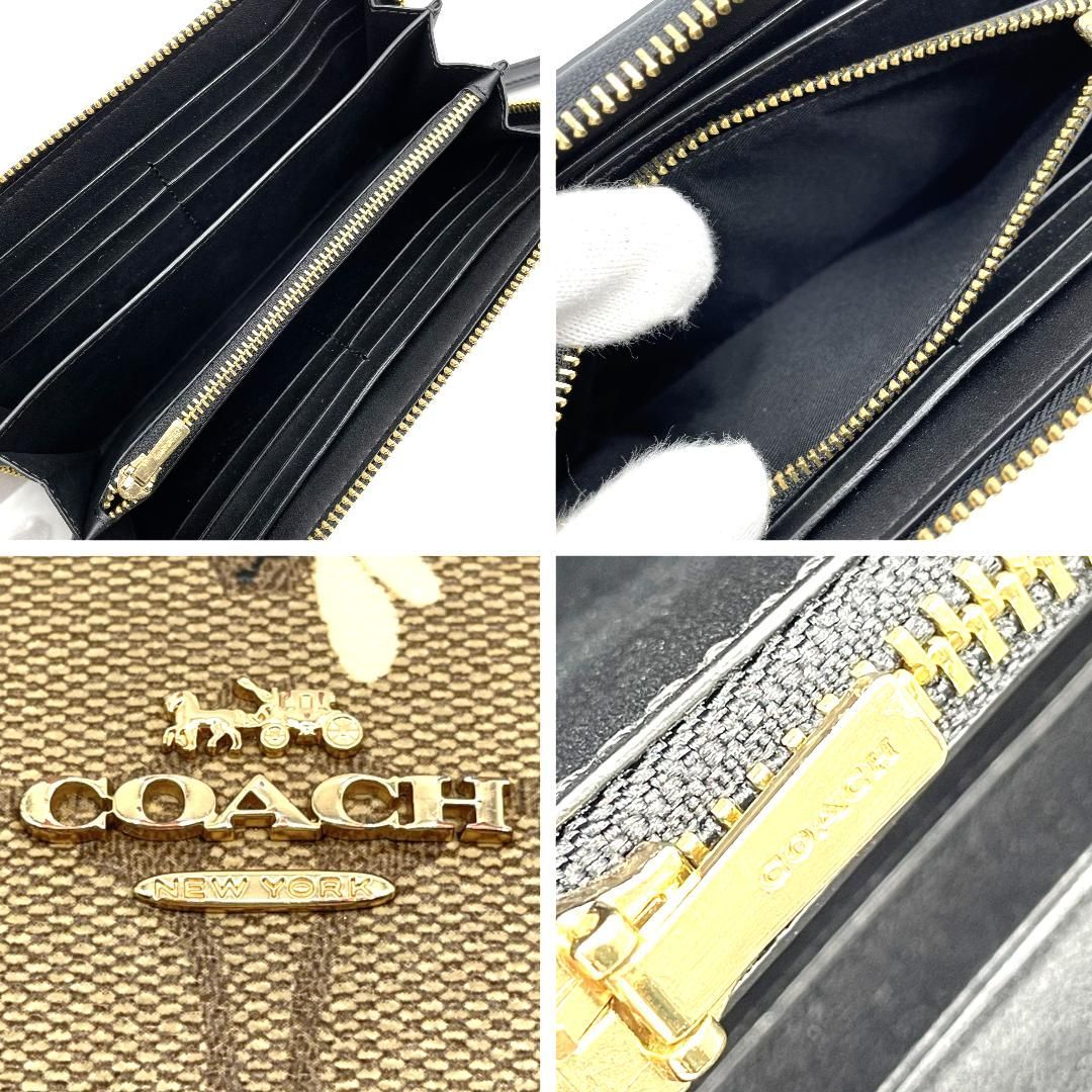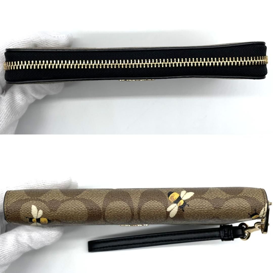 Coachのシグネチャー柄PVCを使用した長財布です。ブラウン系のシグネチャーキャンバスに蜂モチーフのプリントをあしらった、遊び心と上品さを兼ね備えたデザインが特徴です。ラウンドファスナー仕様で大きく開き、紙幣スペースやカードポケット、小銭入れを備えた収納力の高い設計となっています。取り外し可能なストラップ付きのため、クラッチ感覚での使用やバッグからの取り出しもスムーズです。ゴールドカラーの金具が全体を引き締め、日常使いからお出かけまで幅広いシーンで活躍する実用性とデザイン性を兼ね備えたアイテムです。