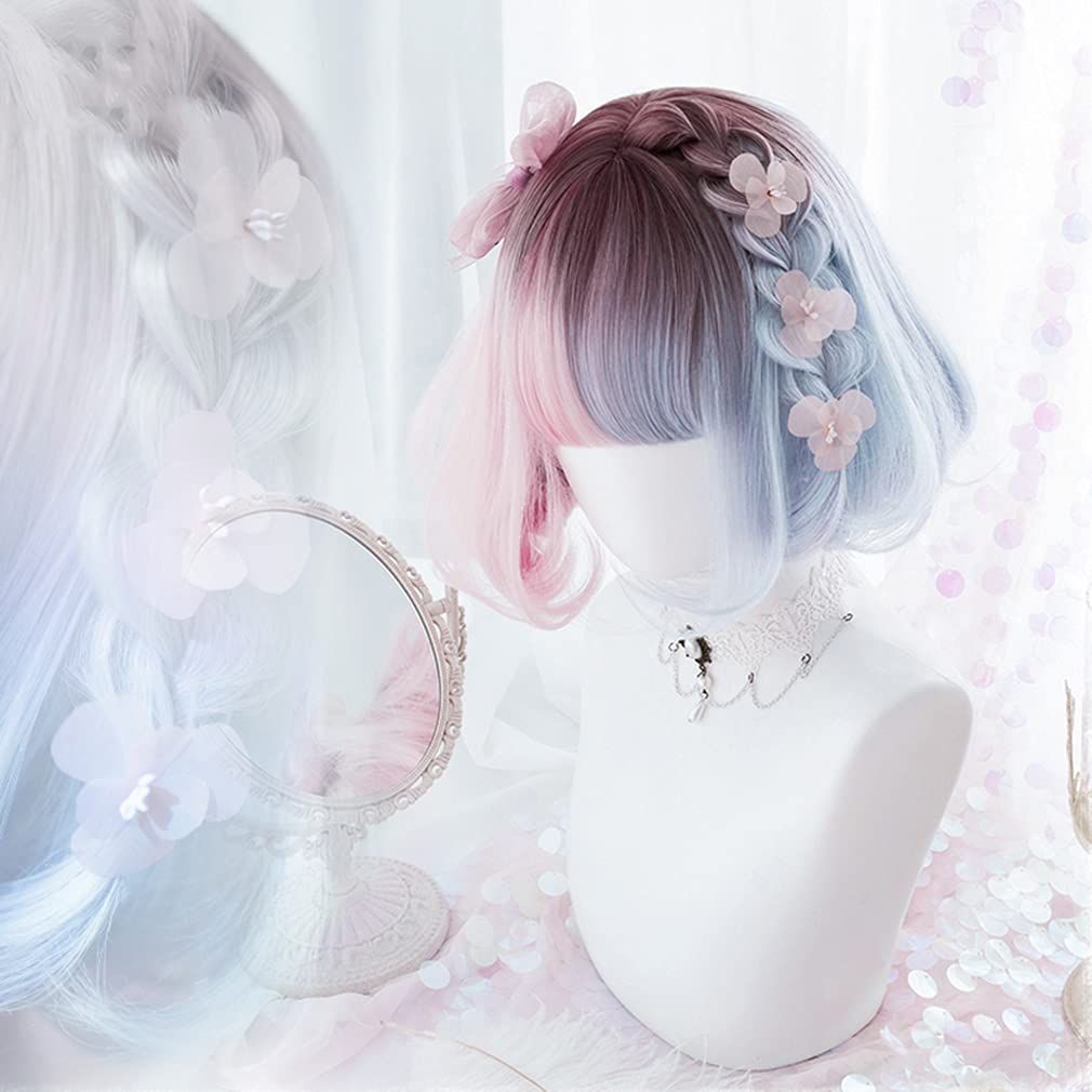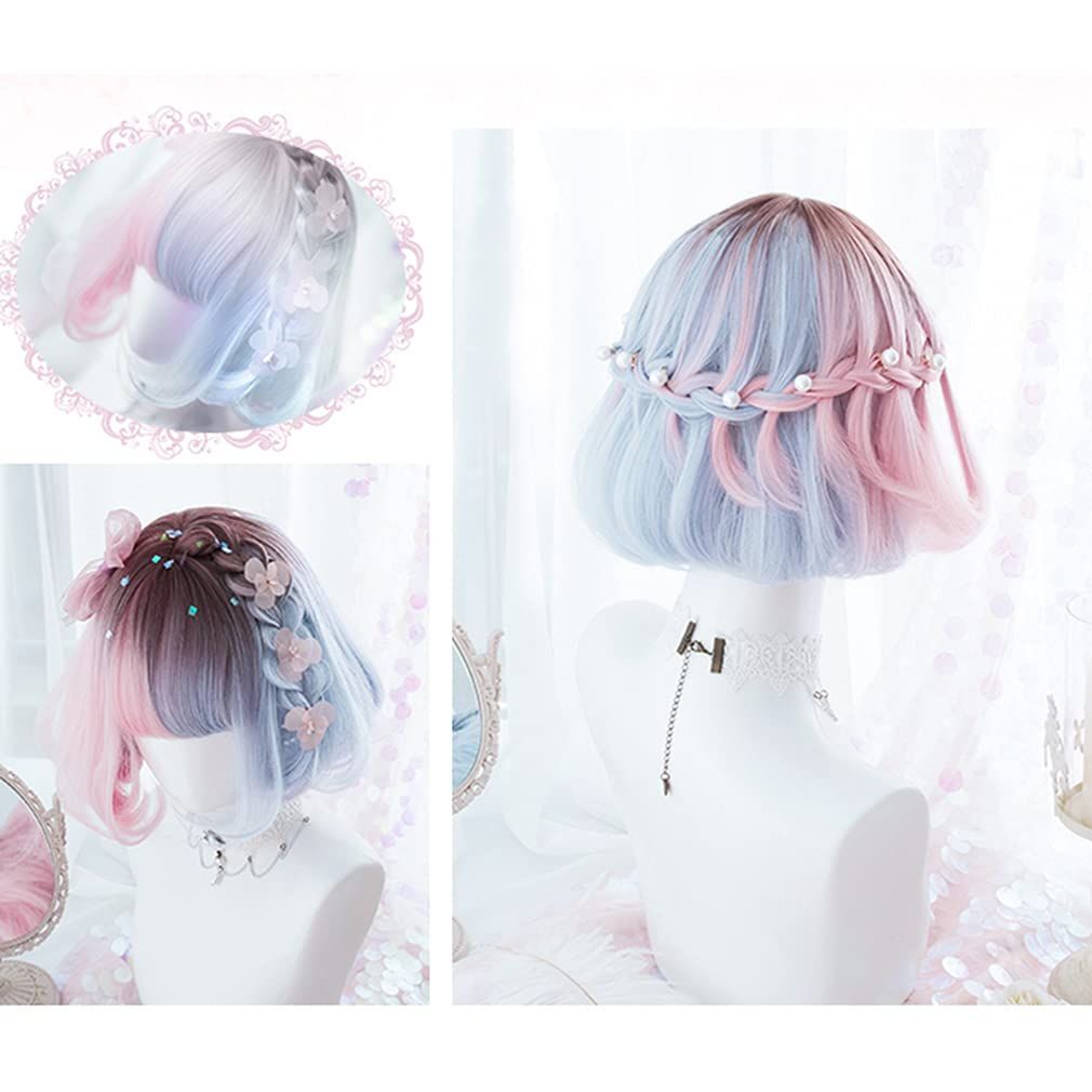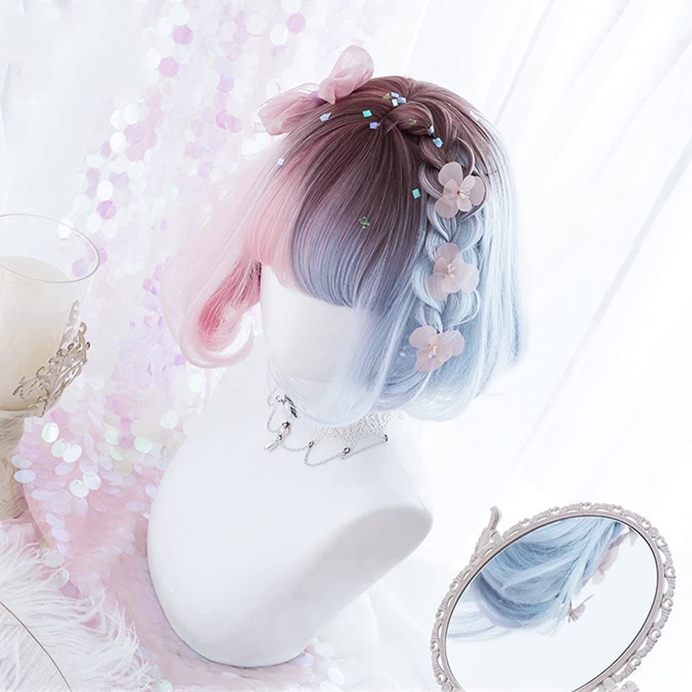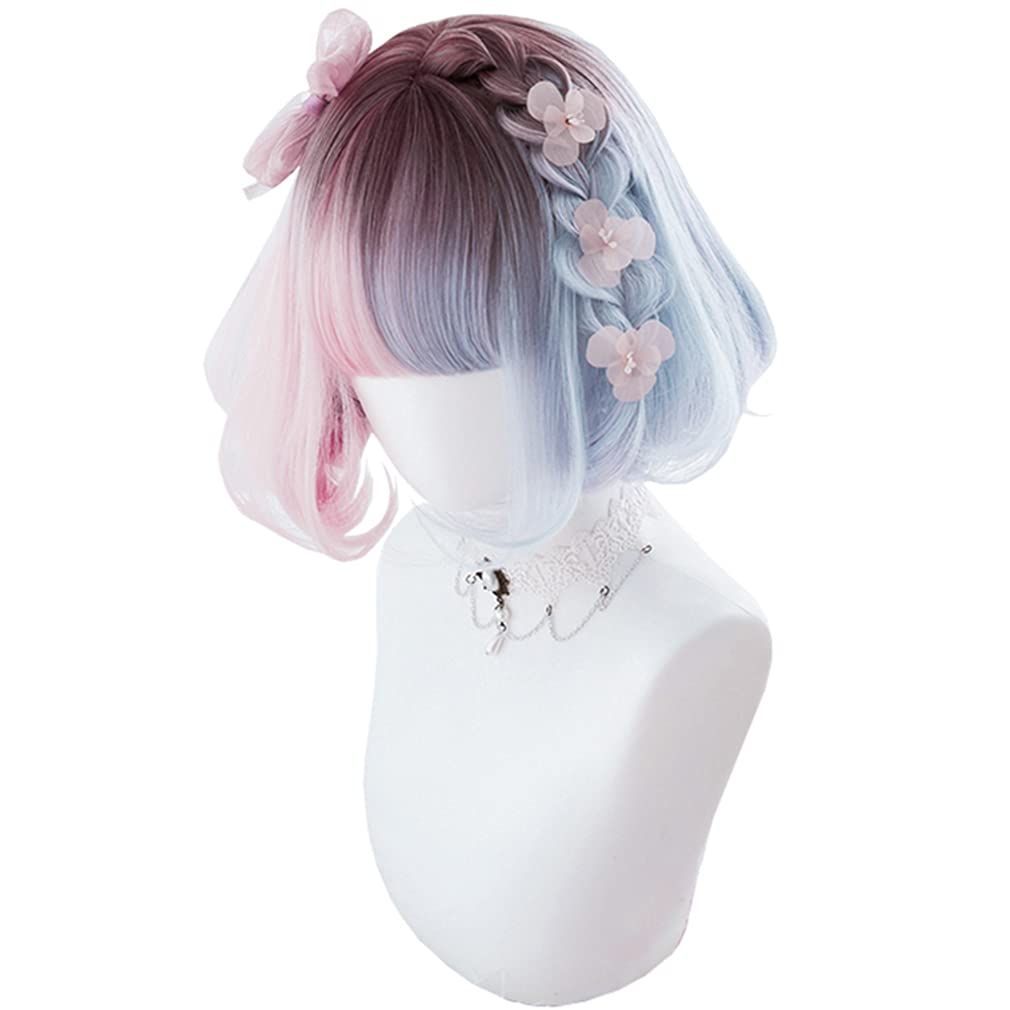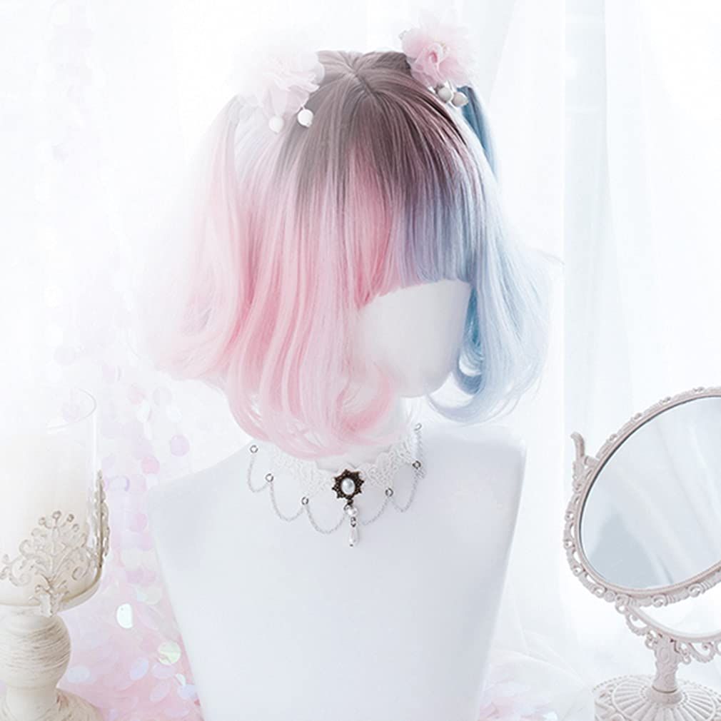 ウィッグ ロリータ 原宿風 GAL系 コスプウィッグ ゴスロリ 耐熱 左右色違い (ピンク 水色) メッシュ ボブ 森ガール ゆめかわいい お姫 小顔 パーティー 仮装 日常 かつら wig