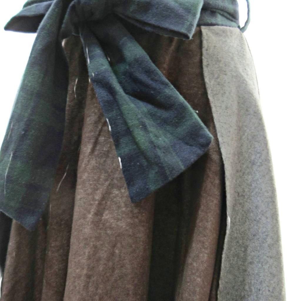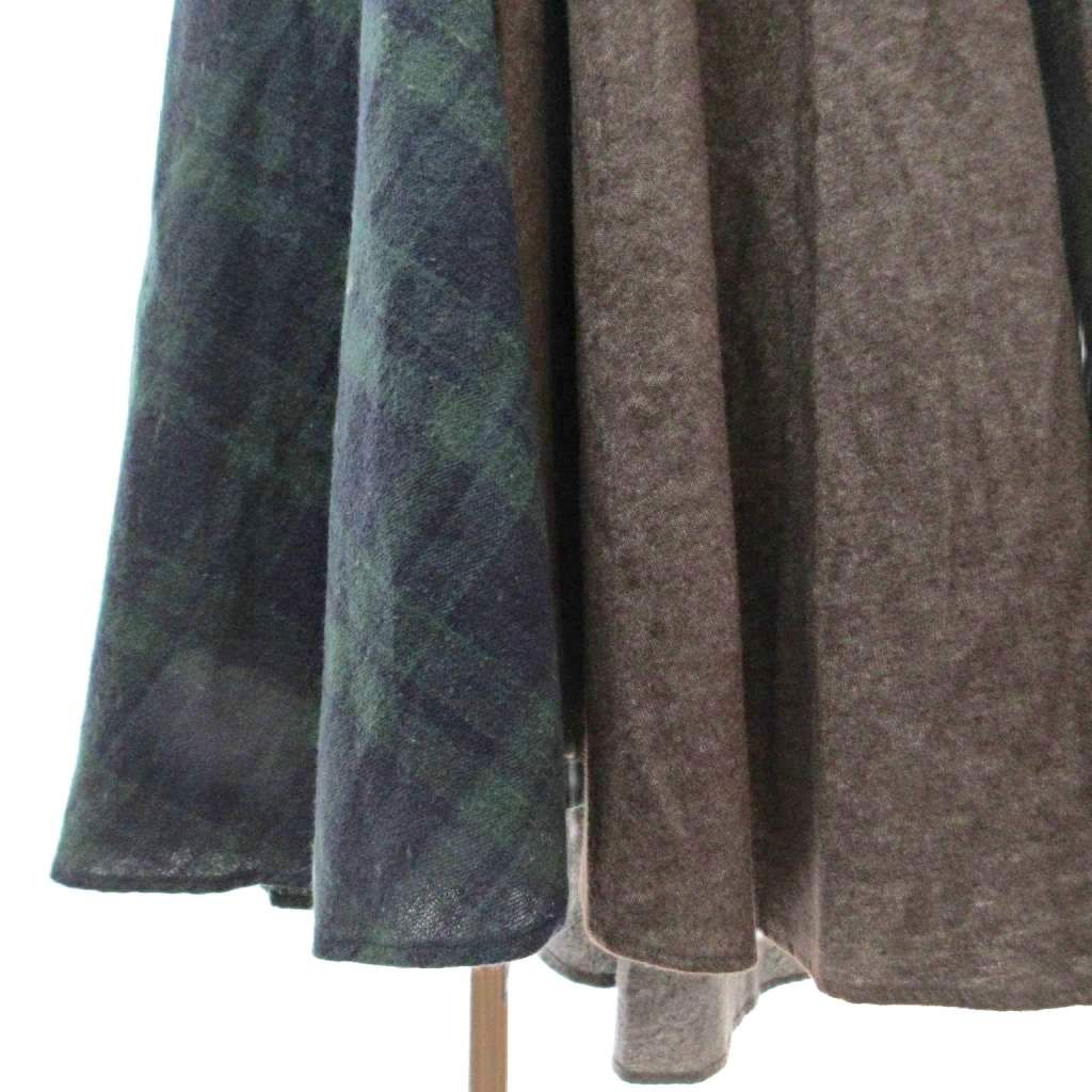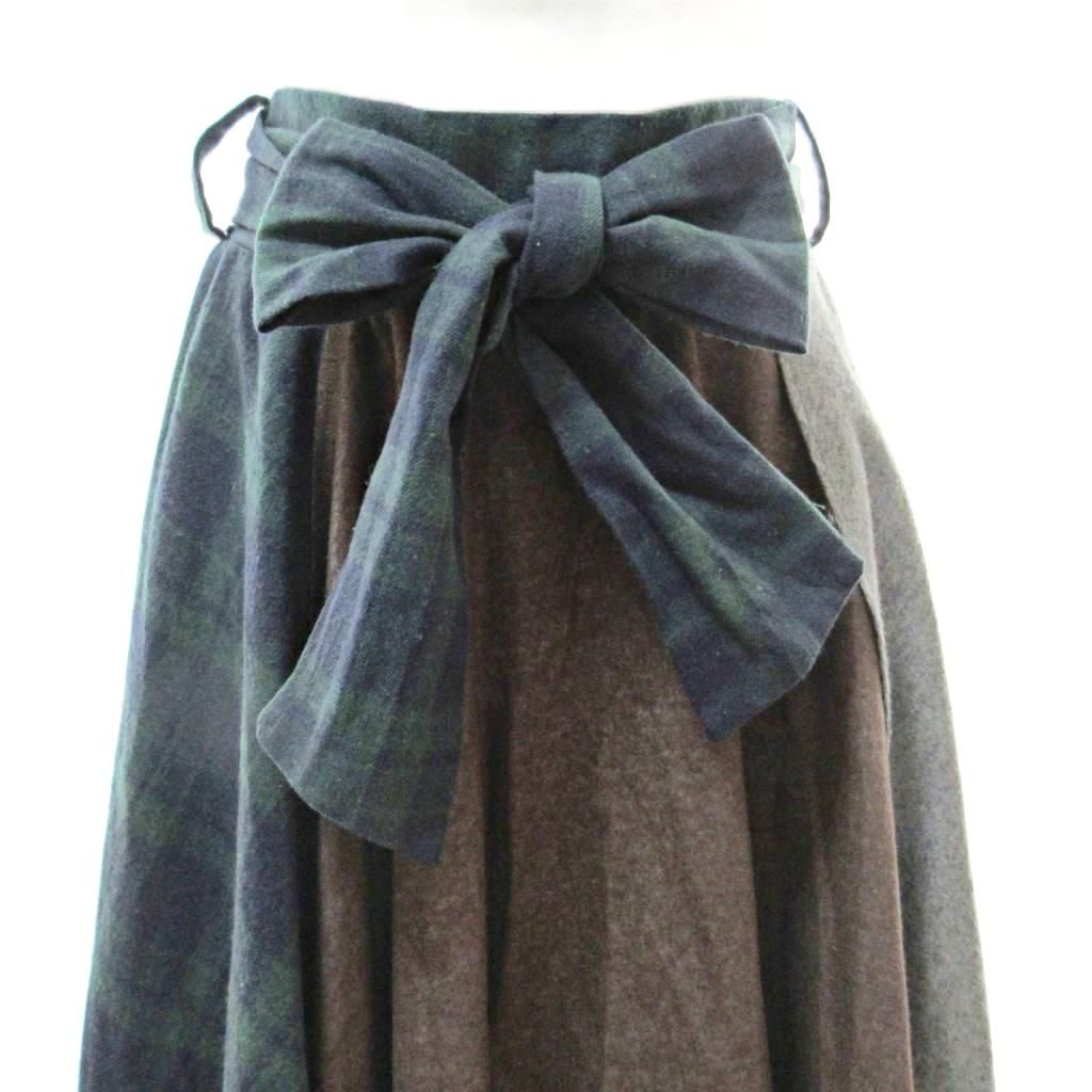 【商品名】ドゥーザムール DEUX AMOUR タグ付き ロング スカート 切替 アシンメトリー チェック柄 リボン フランネル イージーウエスト M-L 緑 茶 グレー 1217