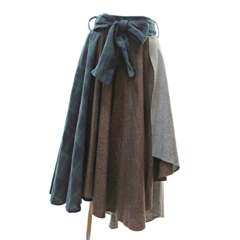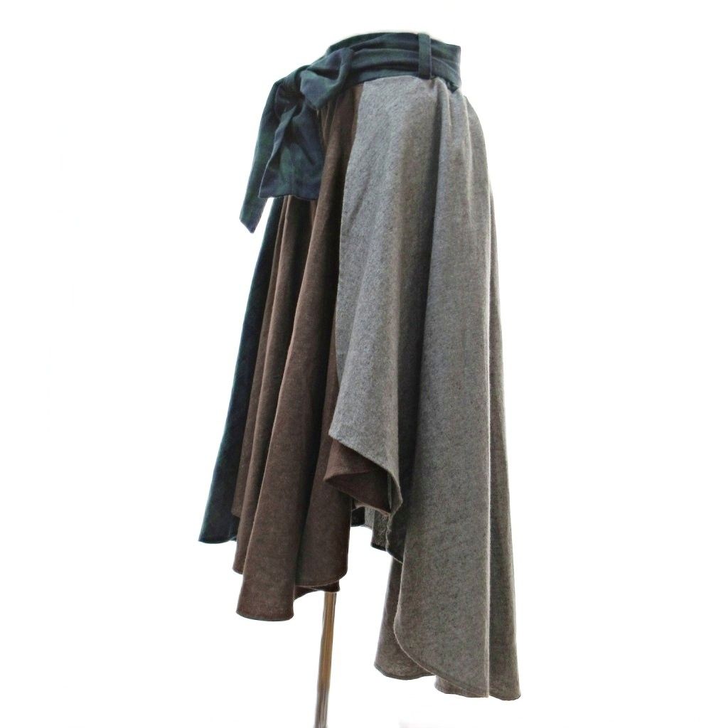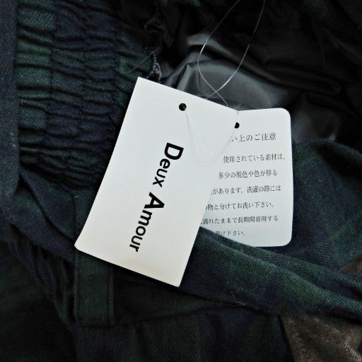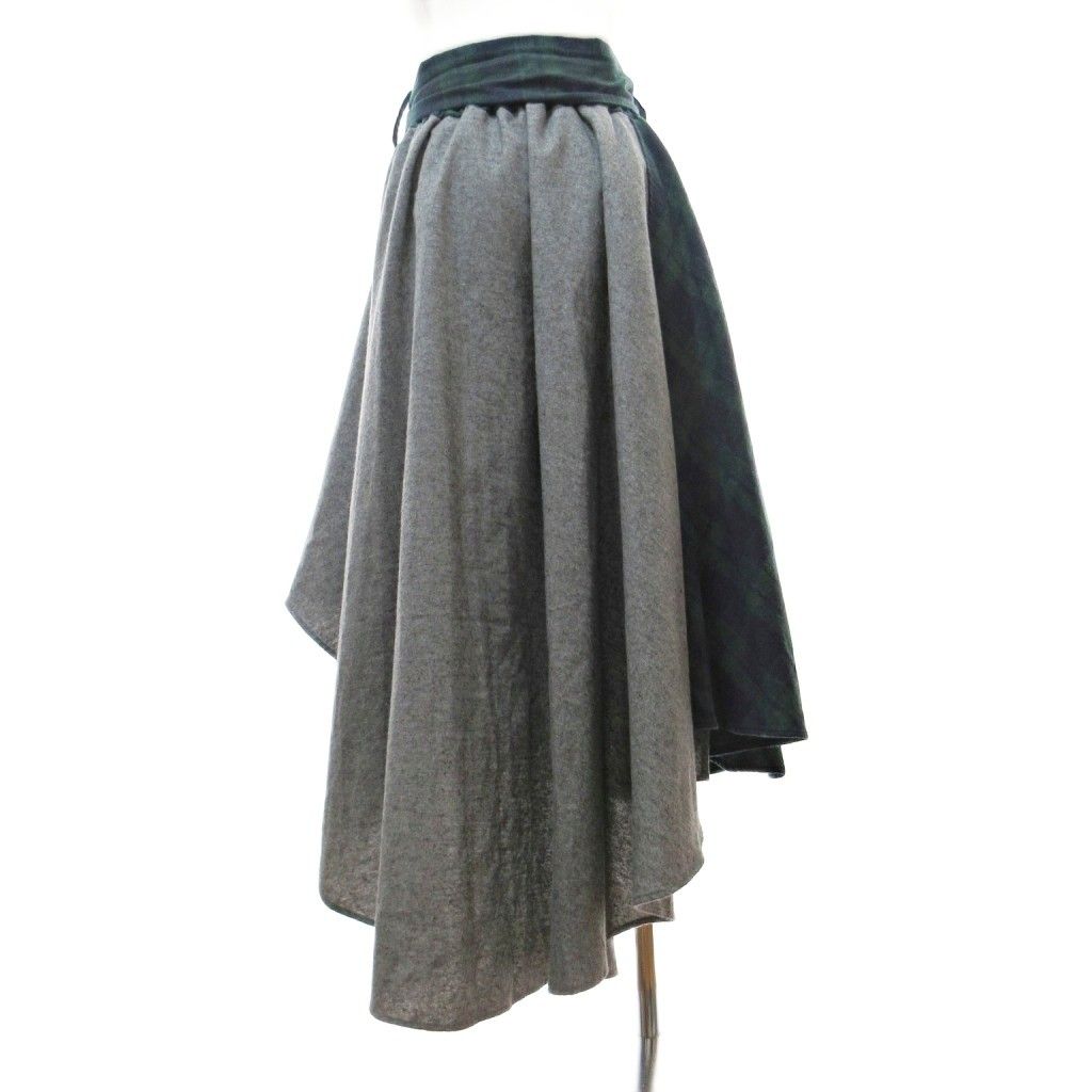 【商品名】ドゥーザムール DEUX AMOUR タグ付き ロング スカート 切替 アシンメトリー チェック柄 リボン フランネル イージーウエスト M-L 緑 茶 グレー 1217