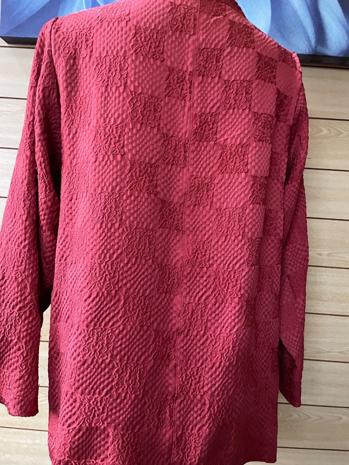 古着の着物を解き、一度洗って、裁断、縫製しています。状態の良い反物の場合水通しをせずそのまま作成しております。汚れや傷みのある部分はできるだけ省いていますが、なかには少し、シミや色あせ、ヤケ、小穴、補修跡のある部分が入ってしまう場合もあります。