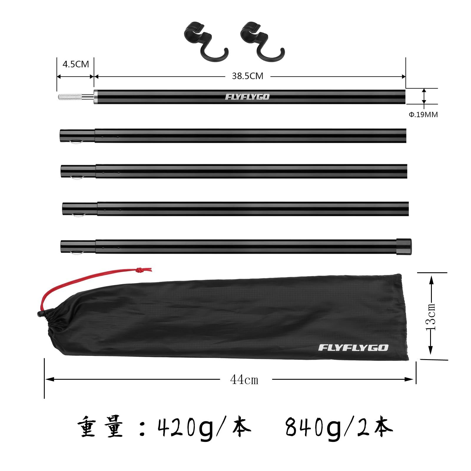 FLYFLYGO アルミテントポール タープポール 2本セット入り 直径19mm 分割式 ジュラルミン ソロキャンプ サブポール ツーリング コンパクト 収納ケース付き
