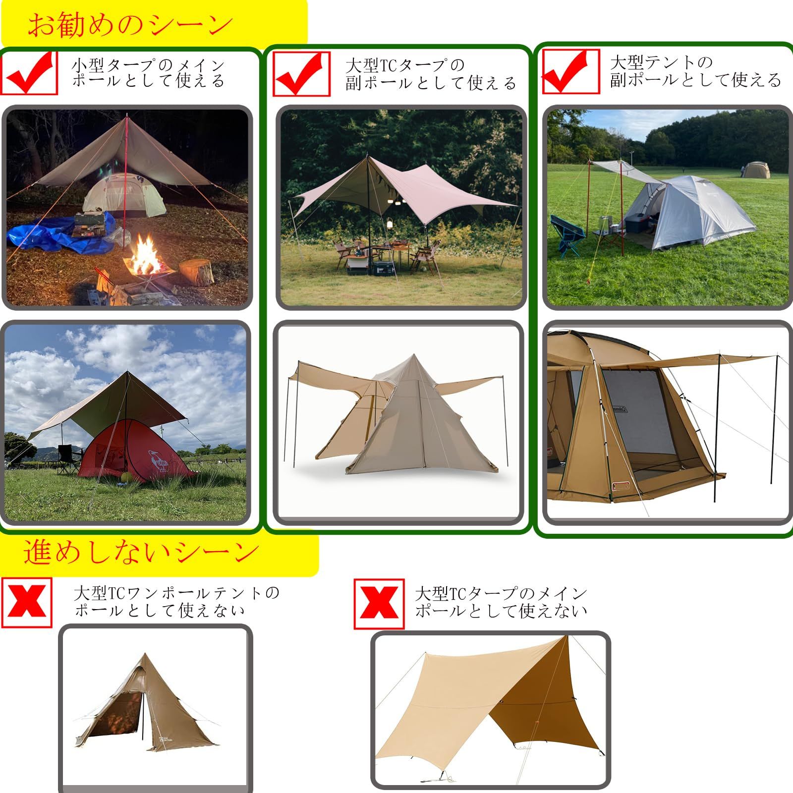 製品の上部には長めの4㎝もあり、タープやテントと接する部分はしっかりと繋いてます。底部は滑り防止ゴムがあり、一般のポールより安定性が高いです。 プラスチックのフックを二つ用意しており、600gまでのものをお引っ掛けくださいませ。