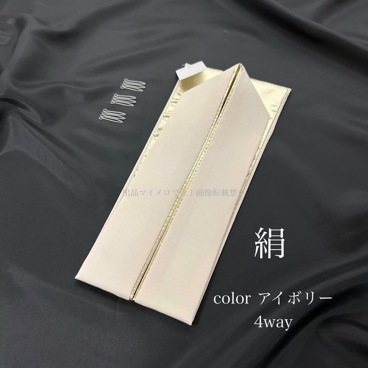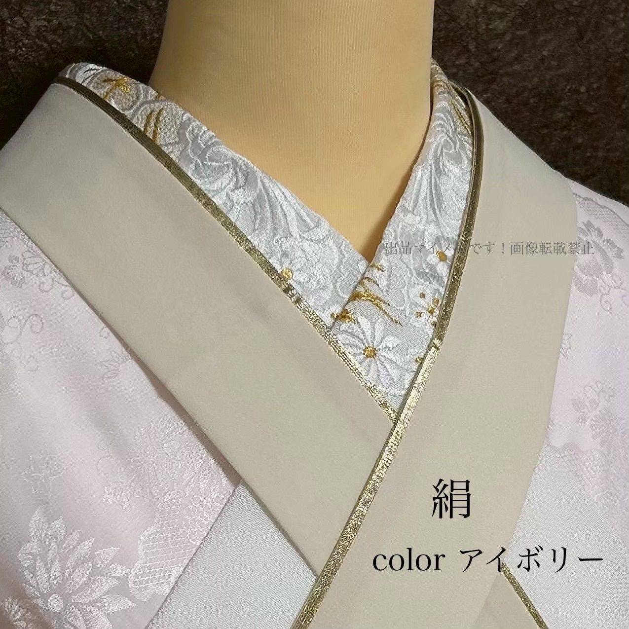 絹(シルク)のアイボリーに金地の1本4通り使える重ね衿と刺繍半衿白金の2点セット