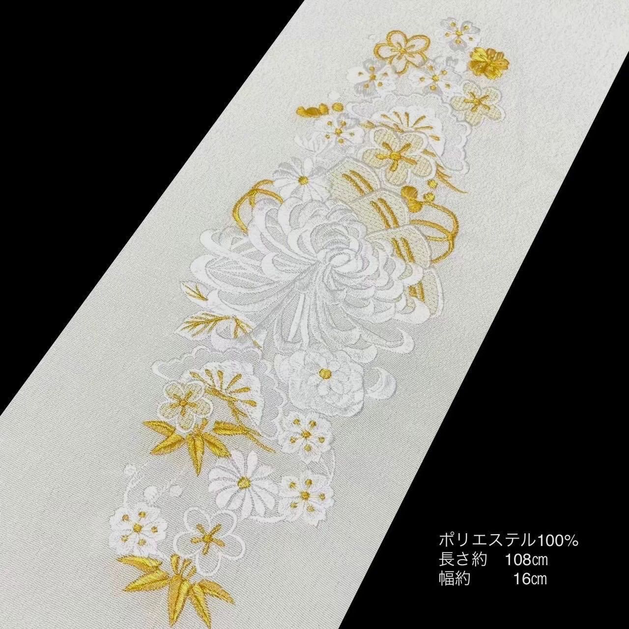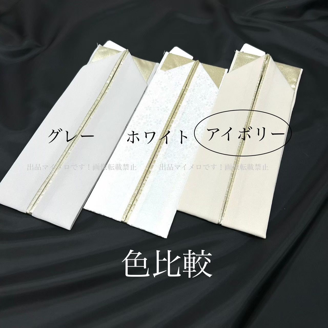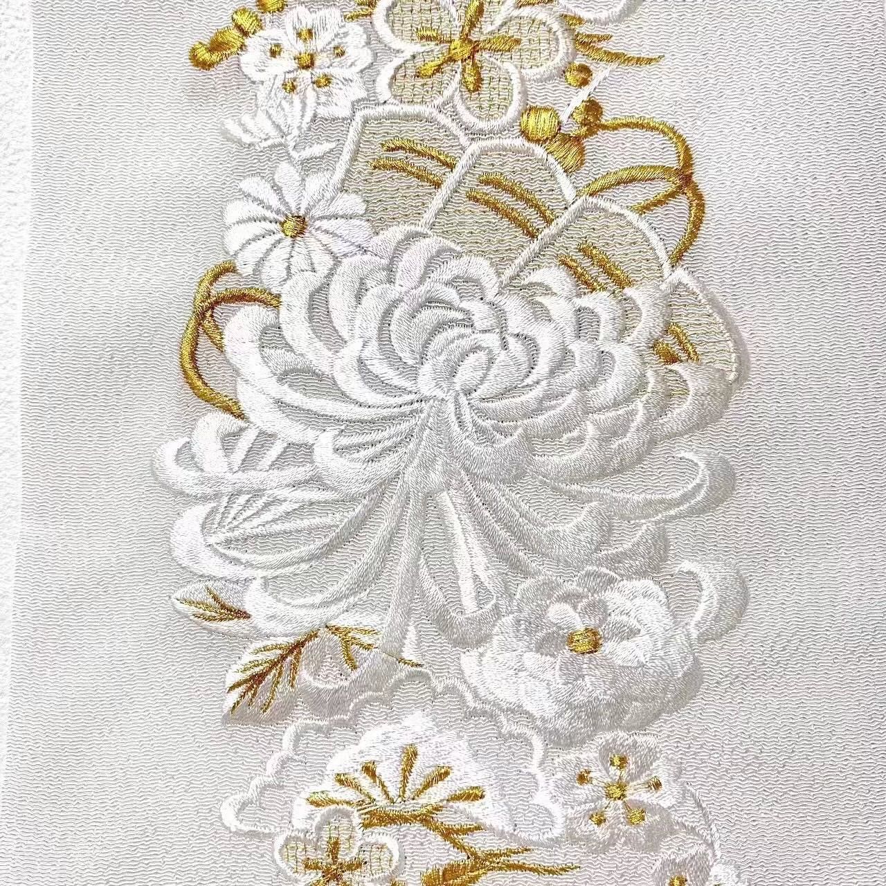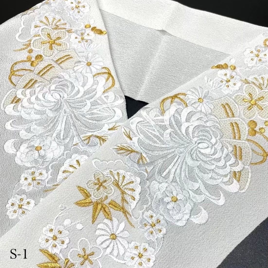 半衿は刺繍が豪華で立体感があり、色味は白と金でシンプルながらも存在感がありお着物をより華やかにします。襟元は自分では見えませんが、人から見た時、思った以上に目にとまる部分です。