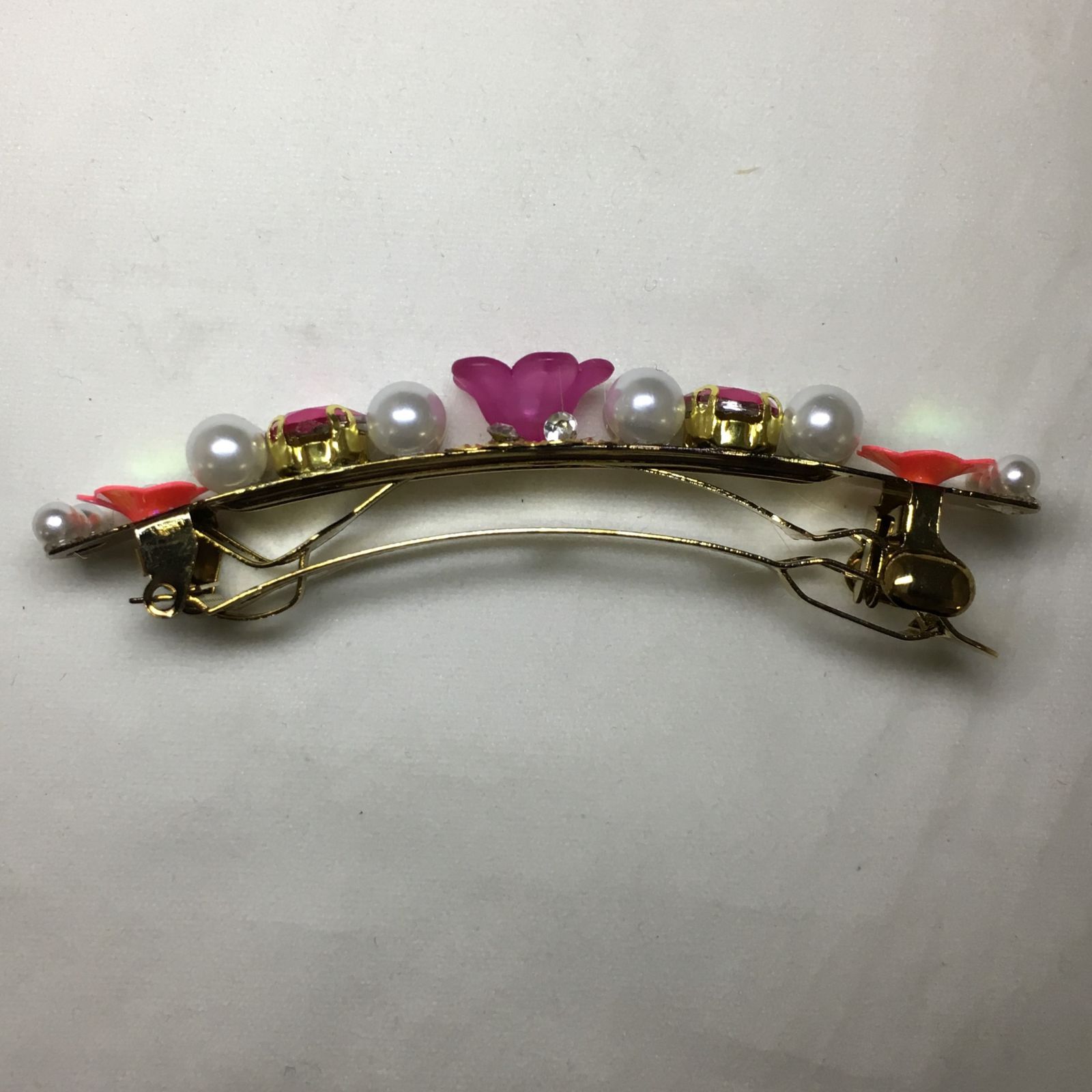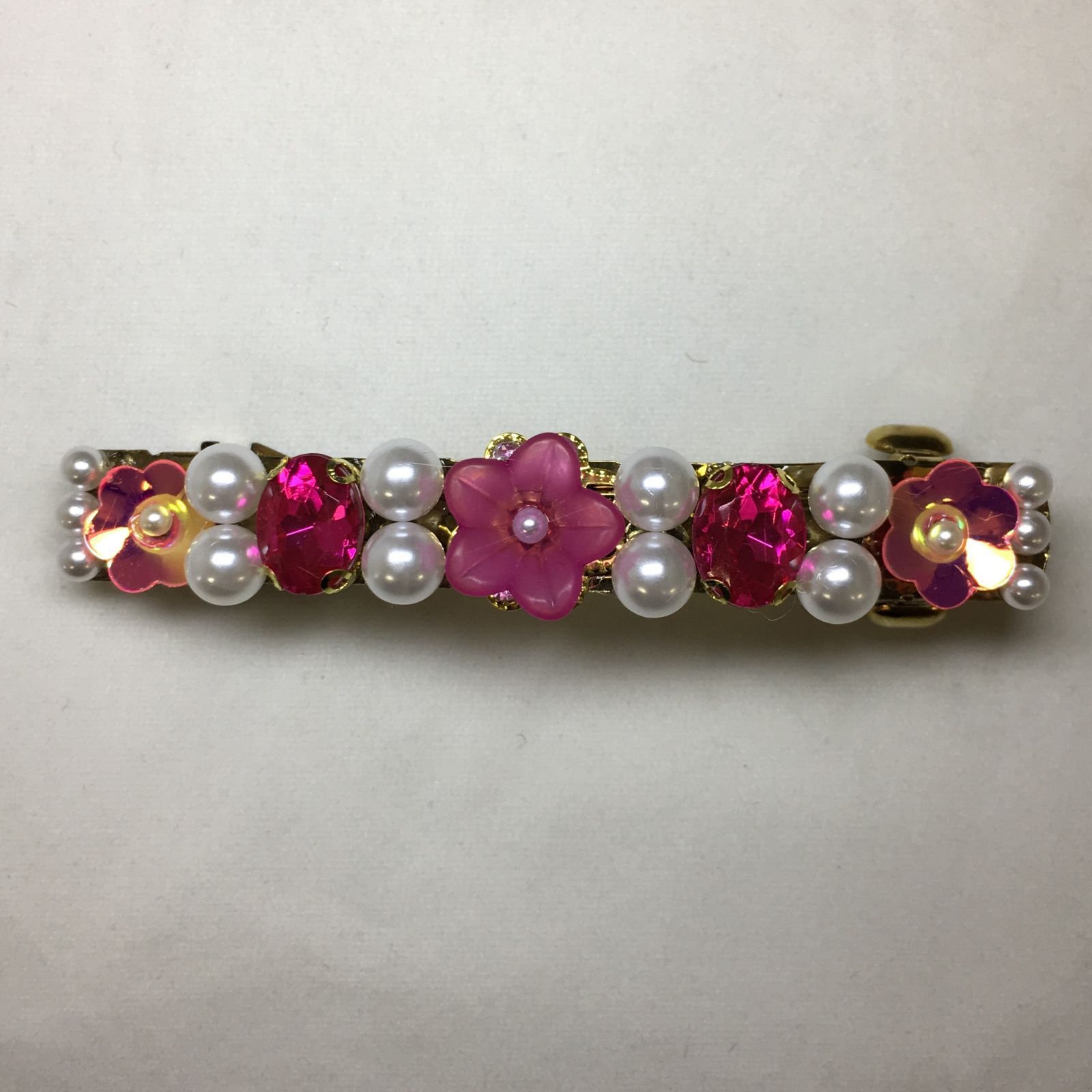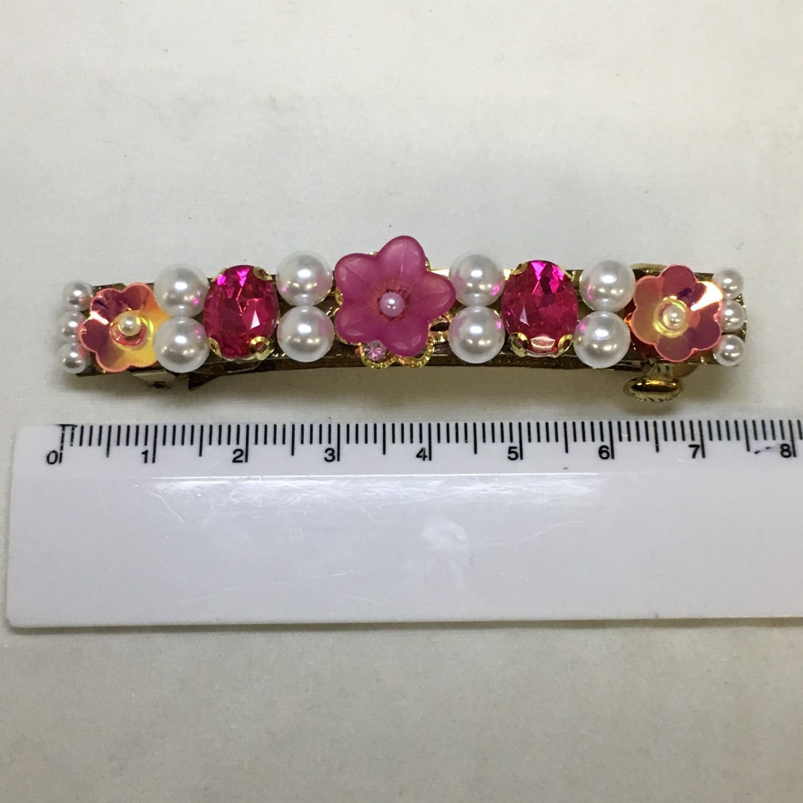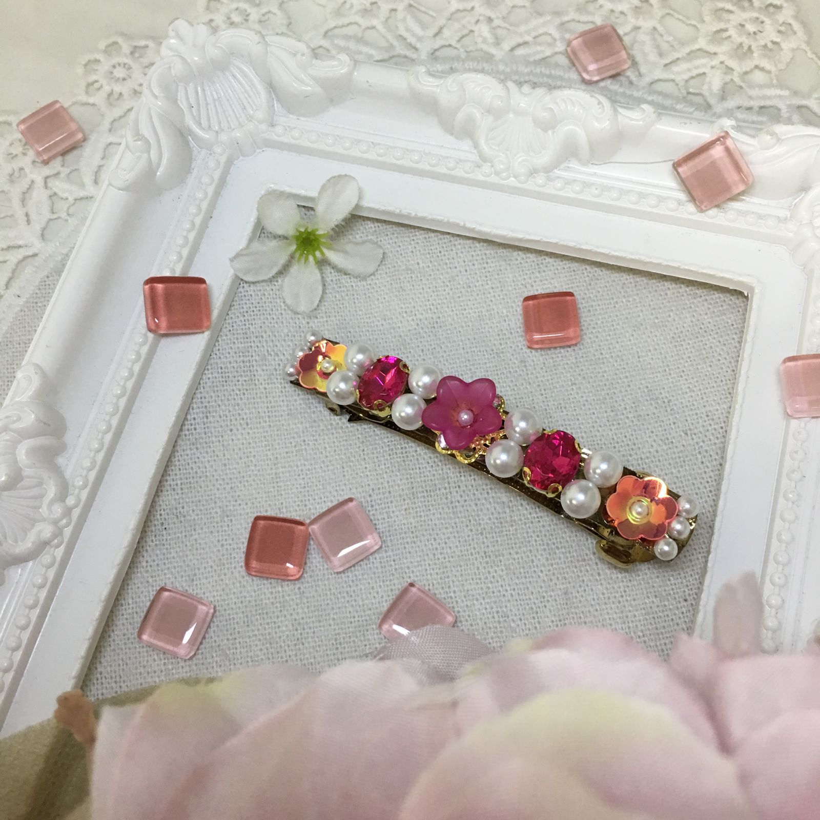キラキラ輝くビジューと可憐な花モチーフを並べ、上品なパールを添えたハンドメイドのバレッタ。華やかさと可愛らしさを両立し、日常から特別な日まで髪元を彩ります。
