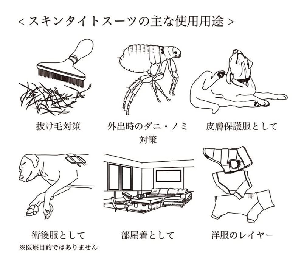 飼い主の悩みを解決してくれるスキンタイトスーツ抜け毛対策、外出時のノミ・ダニ対策、部屋着として皮膚保護服として、術後服として(※医療目的ではありません)お洗濯可能、通気性・速乾性生地使用、360°方向の高伸縮生地使用素材:ACRYLIC60%