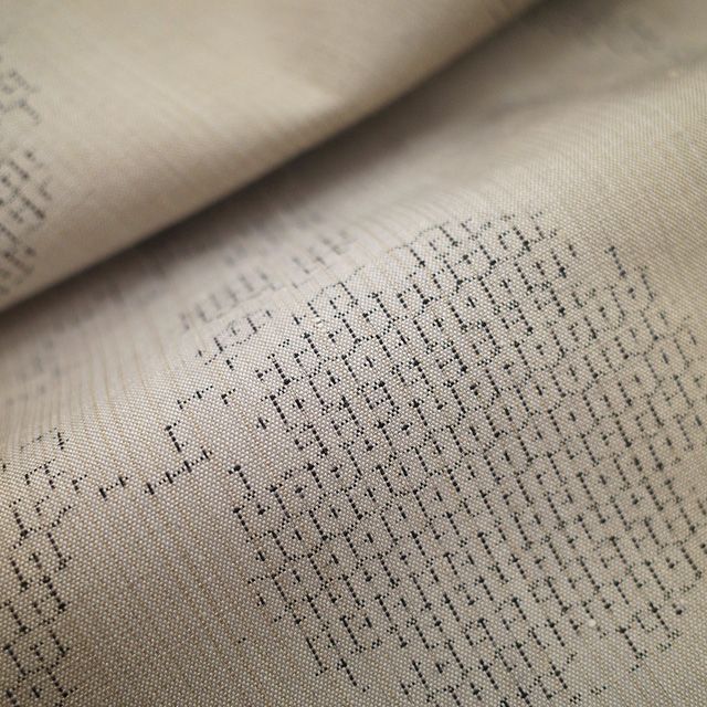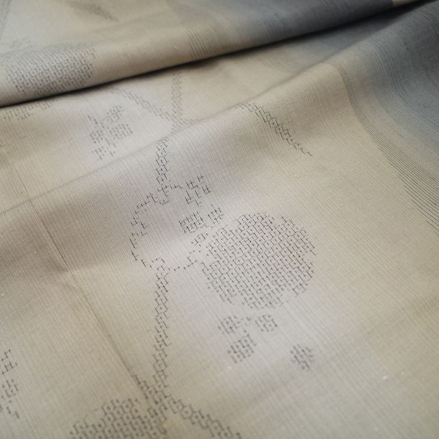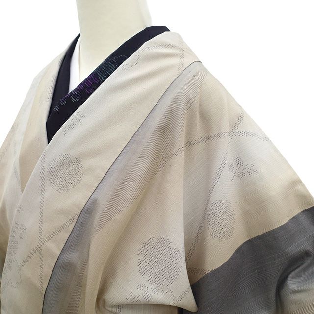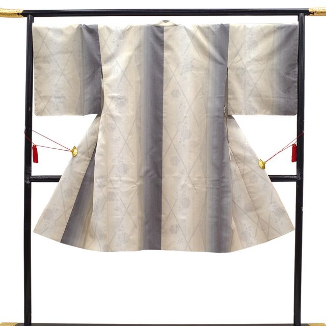 こちらのお品は、淡茶ベージュとグレーのぼかし縞の地に、雪輪や斜め格子が丁寧に織り出されています。