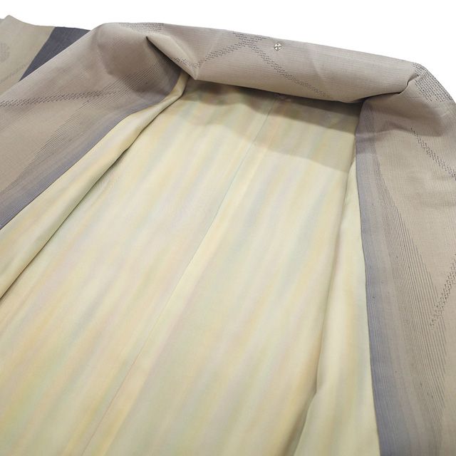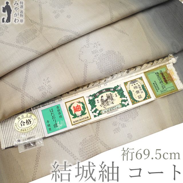 【新古品】 結城紬 道中着 コート 未使用 奥順 はたおり娘 正絹 80亀甲 手織り 淡茶ベージュ グレー 縞 雪輪 斜め格子 カジュアル 春 秋 冬 道中着コート 美品 仕立て上がり 身丈117 裄丈69.5 Lサイズハ オリモノ みやがわ sb16804