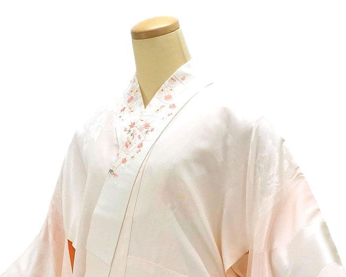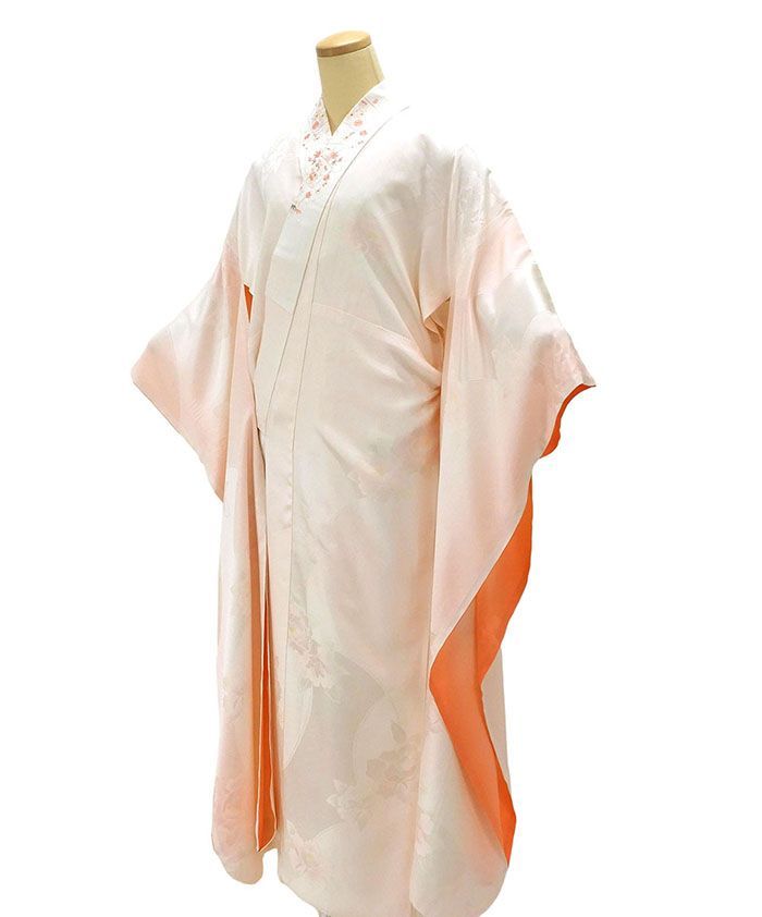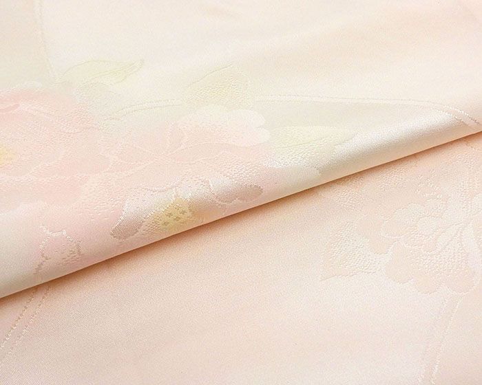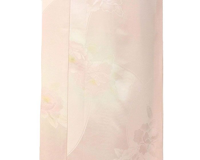 淡いピンクの濃淡ぼかし地に花地紋とピンクや黄色でぼかし模様が柄付けされています。