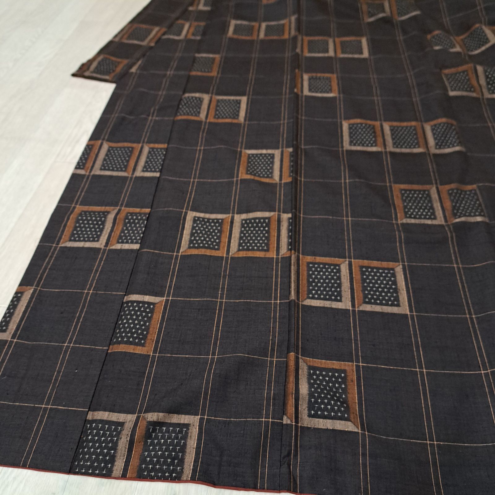 紬 紬着物 絹 袷 カジュアル 普段着物 着物 きもの kimono こげ茶色 格子 絣 ナチュラル