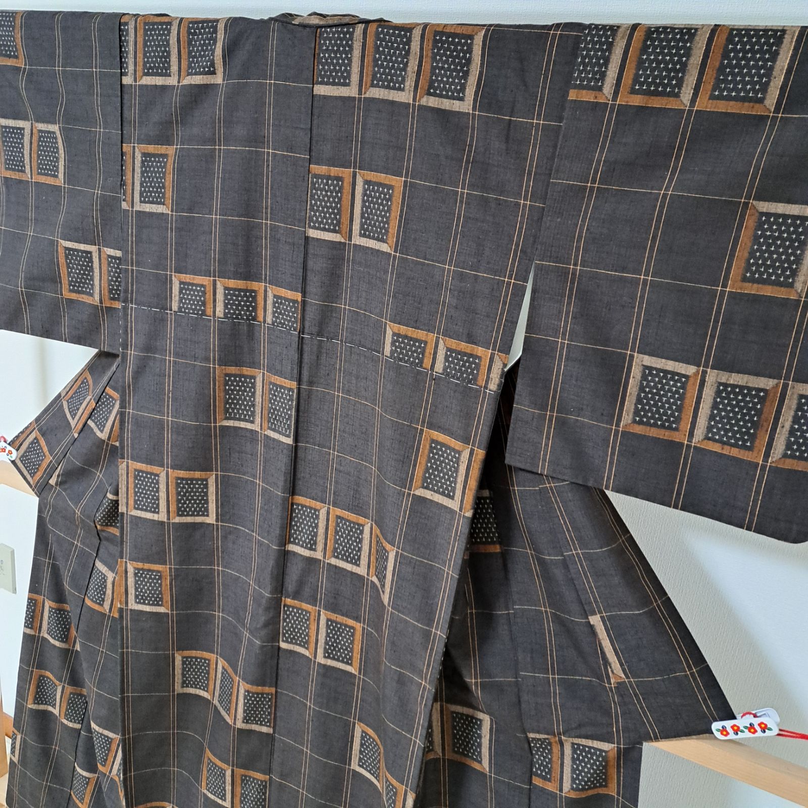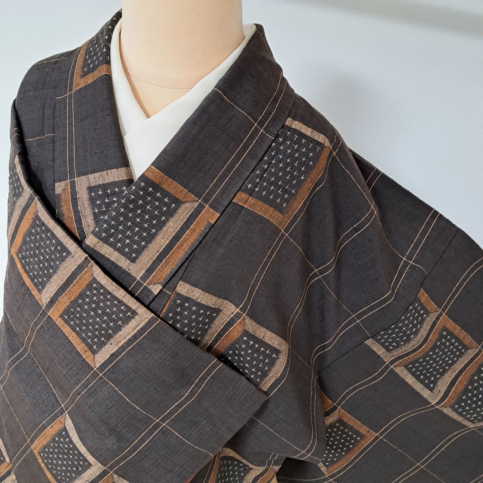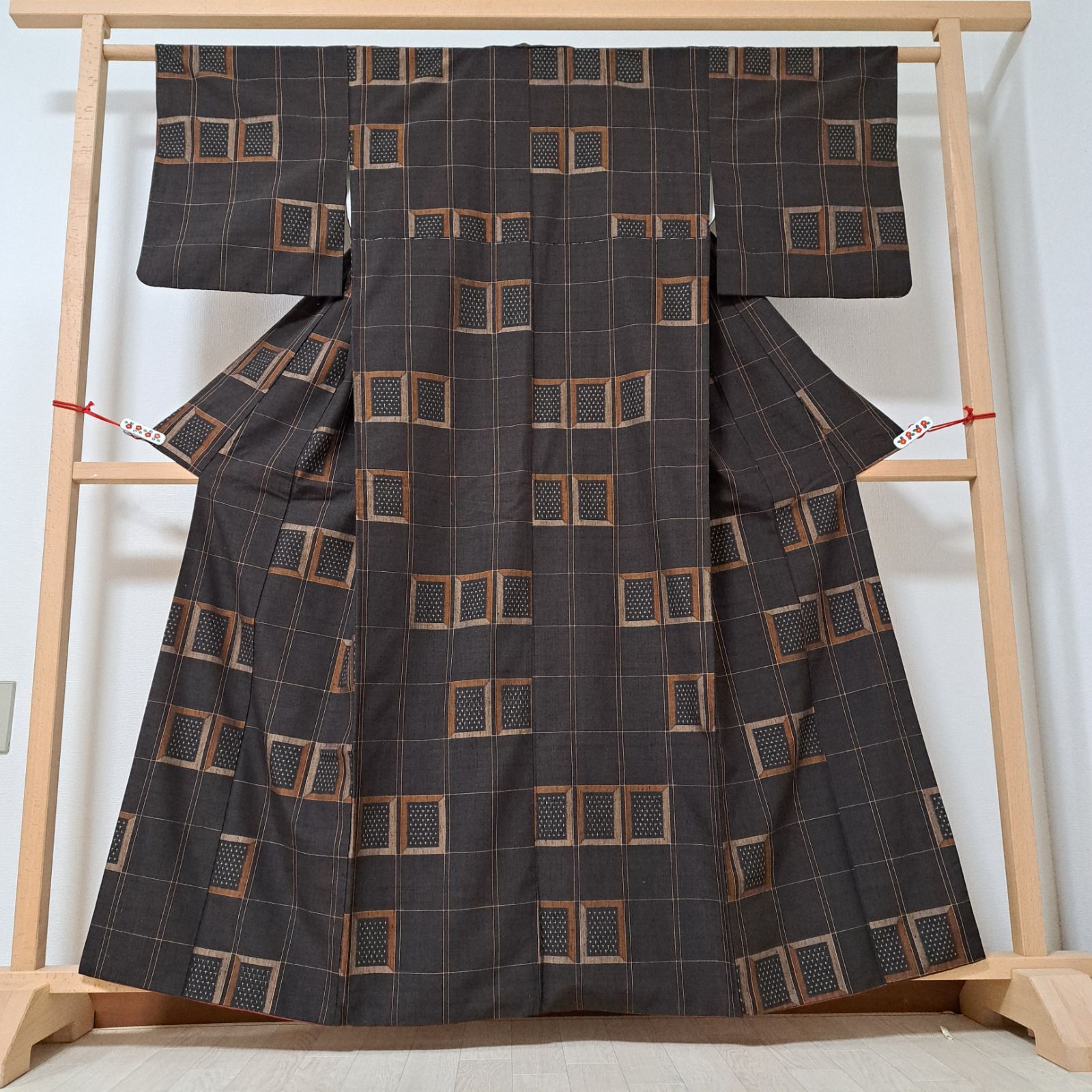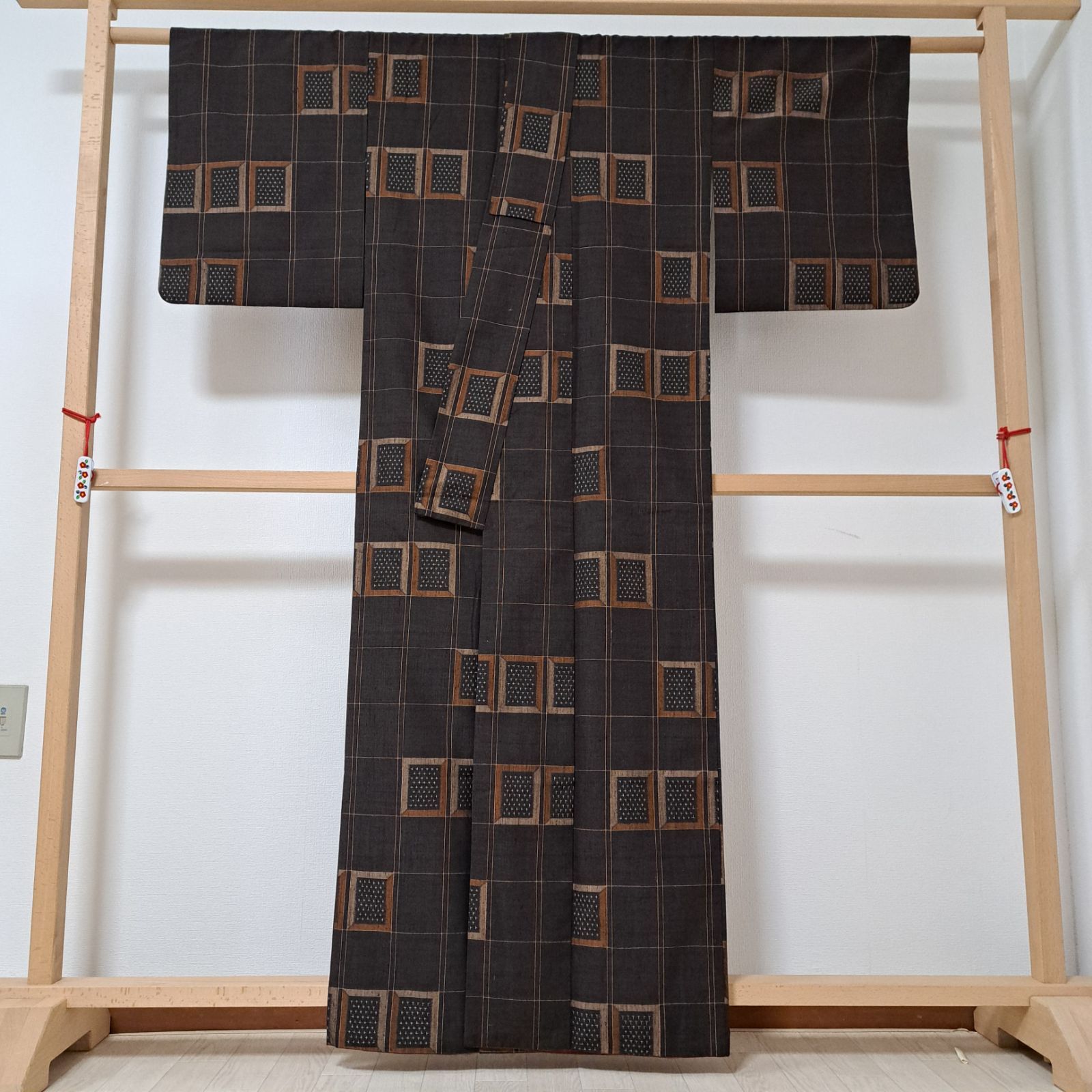 こげ茶系色に格子と絣がデザインされた、袷・紬着物です。