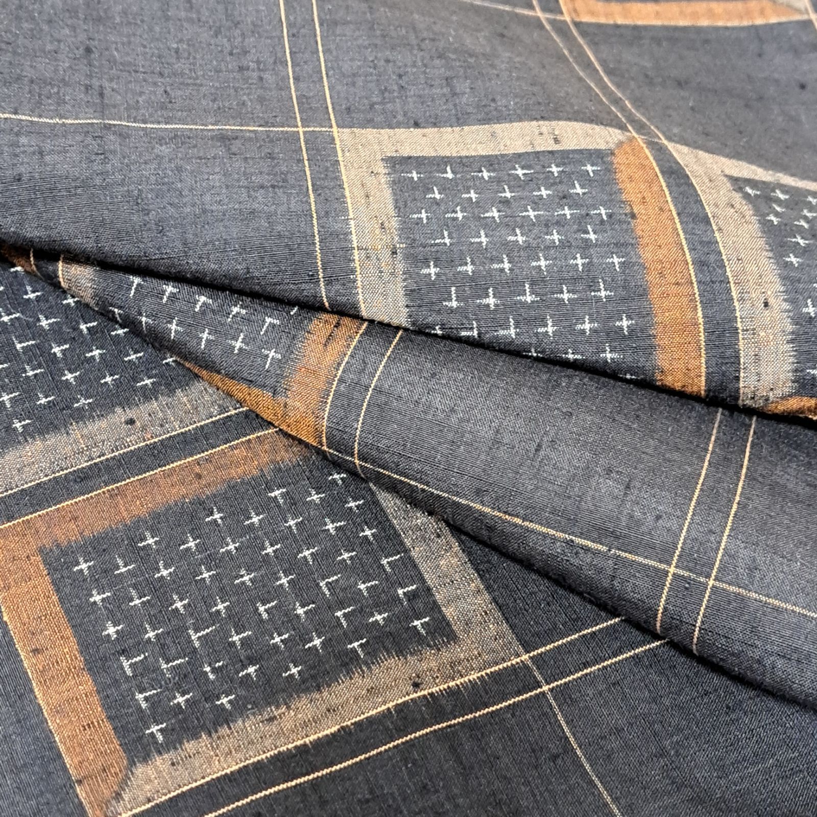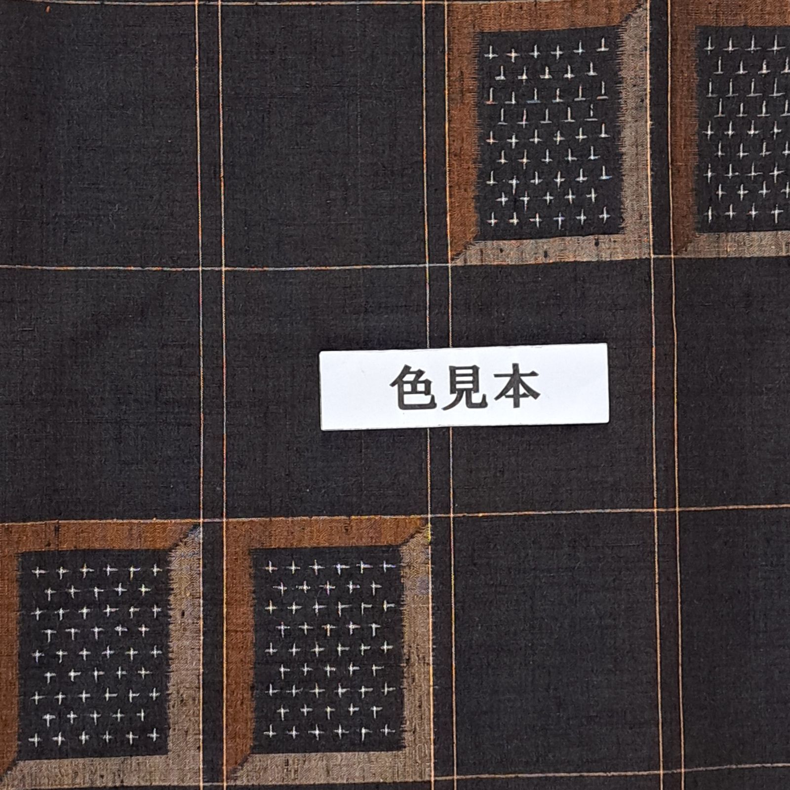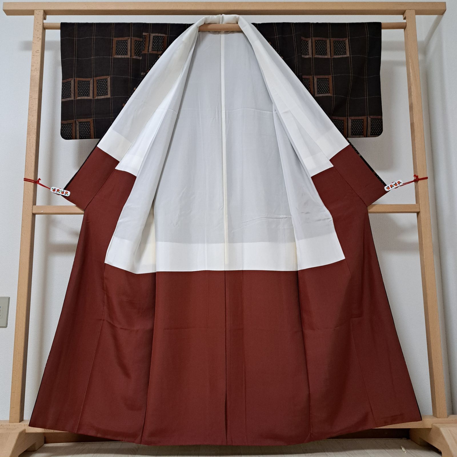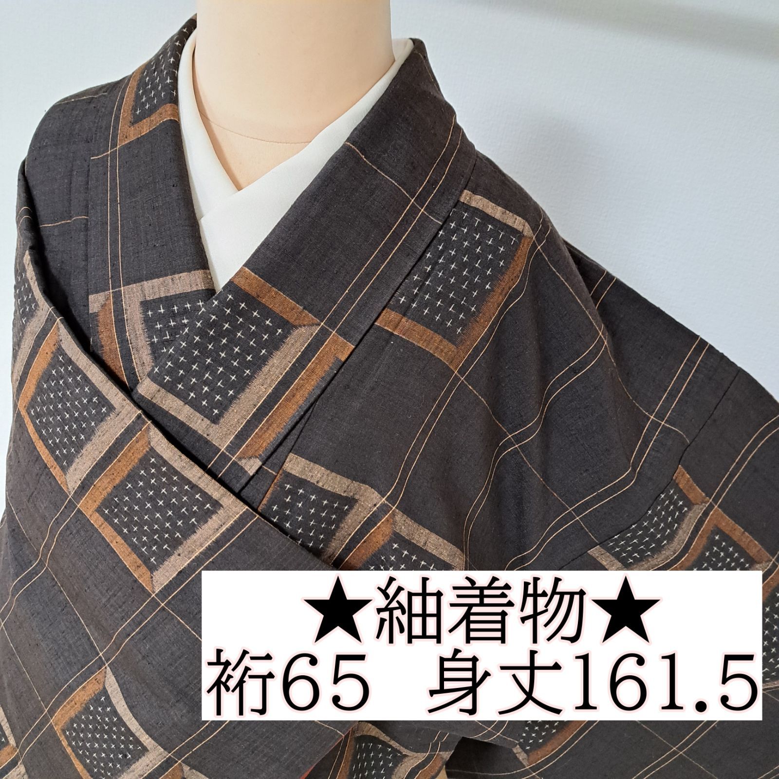 こげ茶系色に格子と絣がデザインされた、袷・紬着物です。