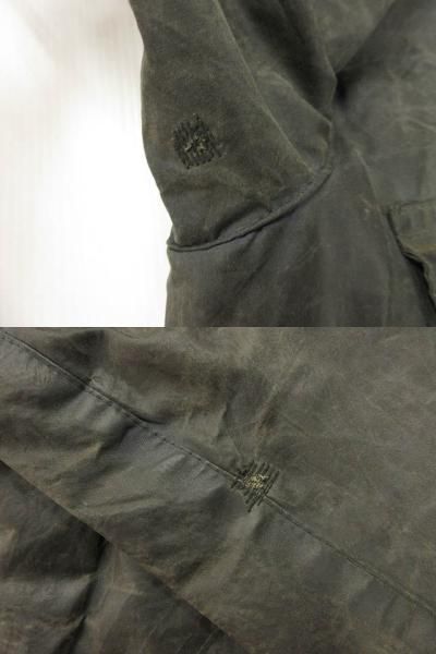 【状態】全体的に色褪せ、シワ、色ムラ、擦れ跡、汚れが多く見受けられます。所々に細かなダメージがございます。右脇下と右袖に補修跡がございます。両袖口付近に別生地を当てて補修された跡がございます。オイルドジャケット特有のベタつきやにおいが付着しています。