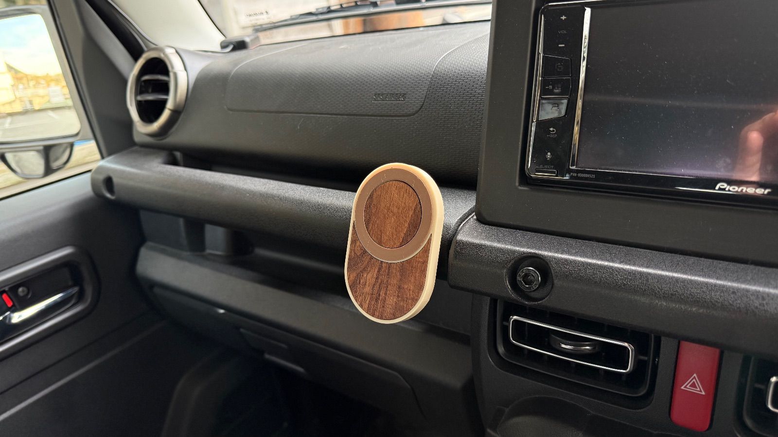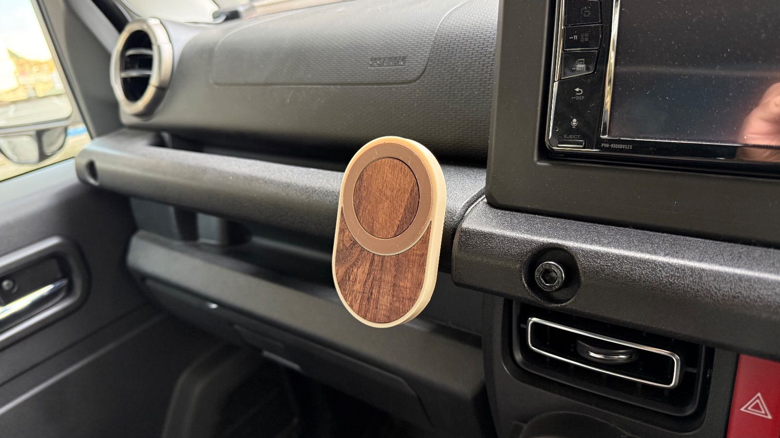 天然木と3Dプリンターを組み合わせて制作した、オリジナルデザインのMagSafe対応スマホホルダーです。