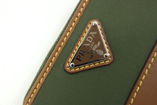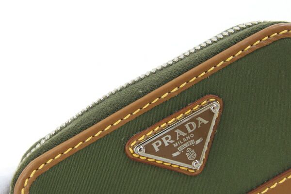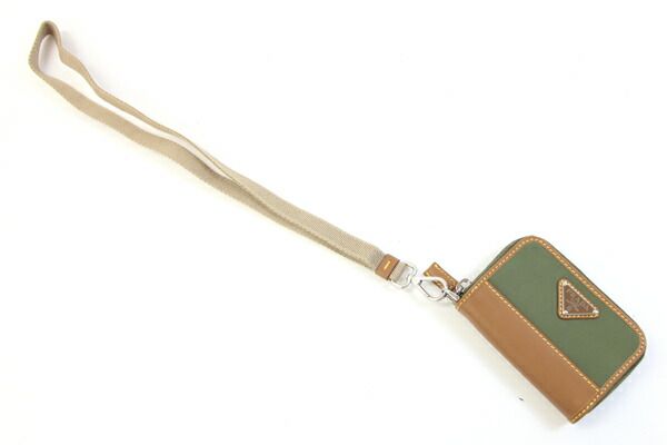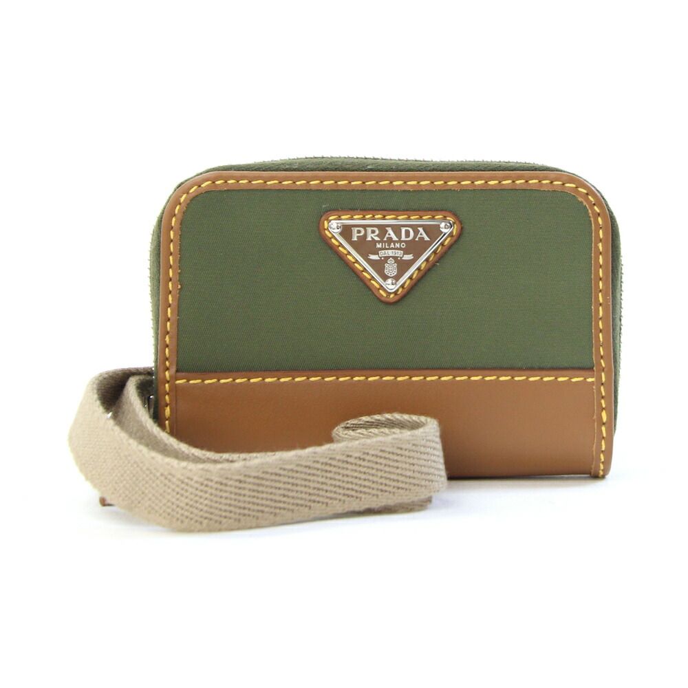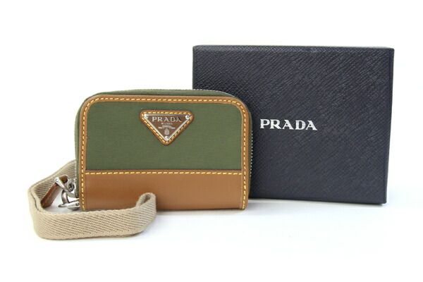プラダコインケース2MR039カーキブラウンナイロンレザー中古ネックストラップ付小銭入れミニ財布ラウンドファスナーコンパクトウォレットレディースメンズPRADA