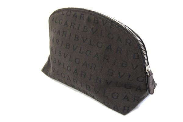 ブルガリポーチロゴマニアダークブラウンキャンバスレザー中古半月型小物入れトラベルポーチメイクコスメポーチレディースBVLGARI