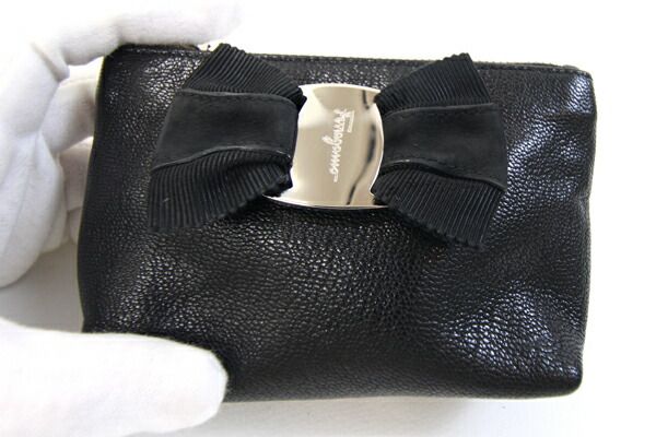 フェラガモポーチヴァラ228291ブラックレザー中古小物入れリボンミニポーチロゴレディースSalvatoreFerragamo