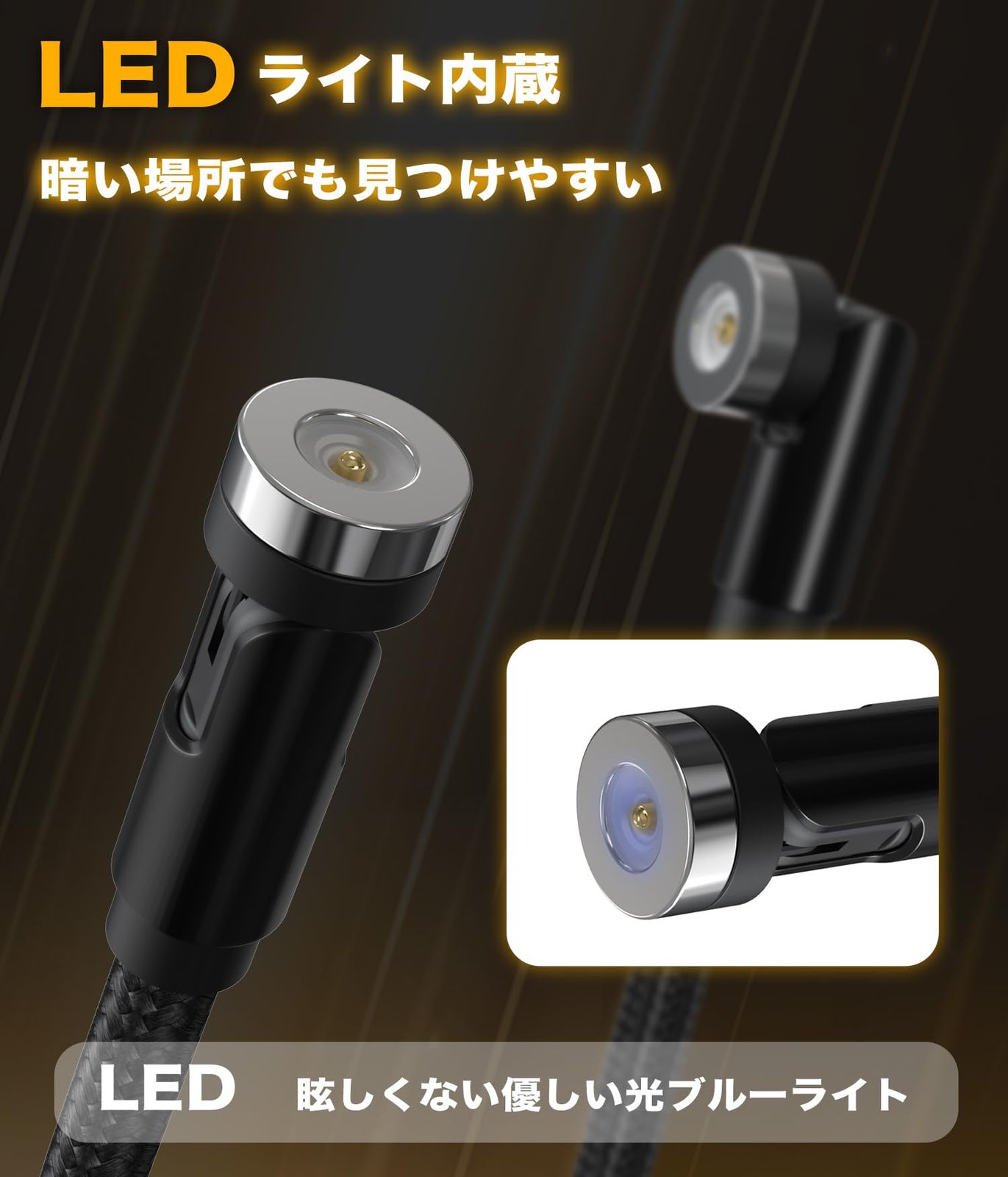 【ソフトLEDライト付き】:マグネットケーブルヘッドにLEDライトがついているので、暗闇でもケーブルを見つけやすいように設計されており、充電コネクタとの接続も磁気で近づけるだけでOK。また、ソフトライトなのでは睡眠の妨げになりません