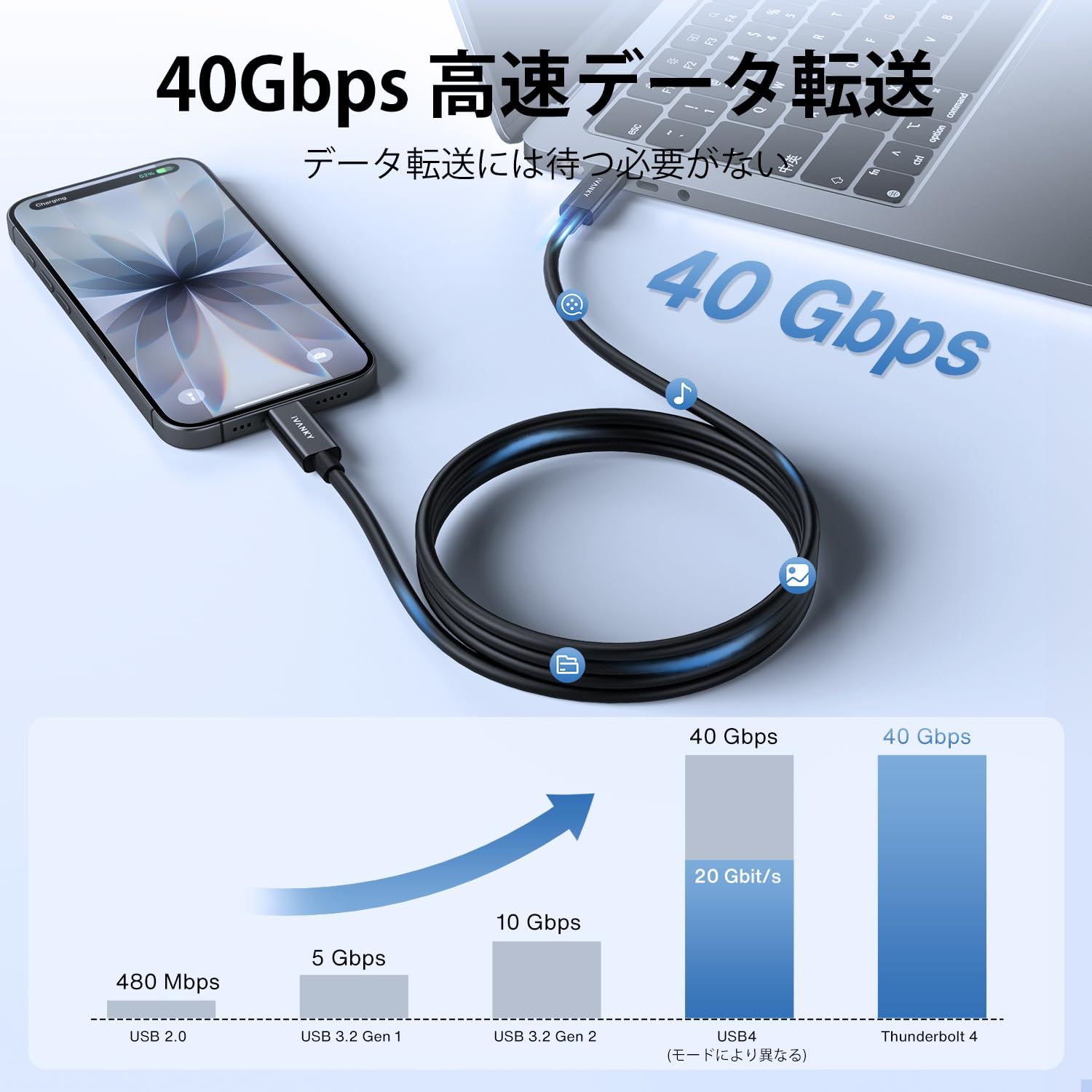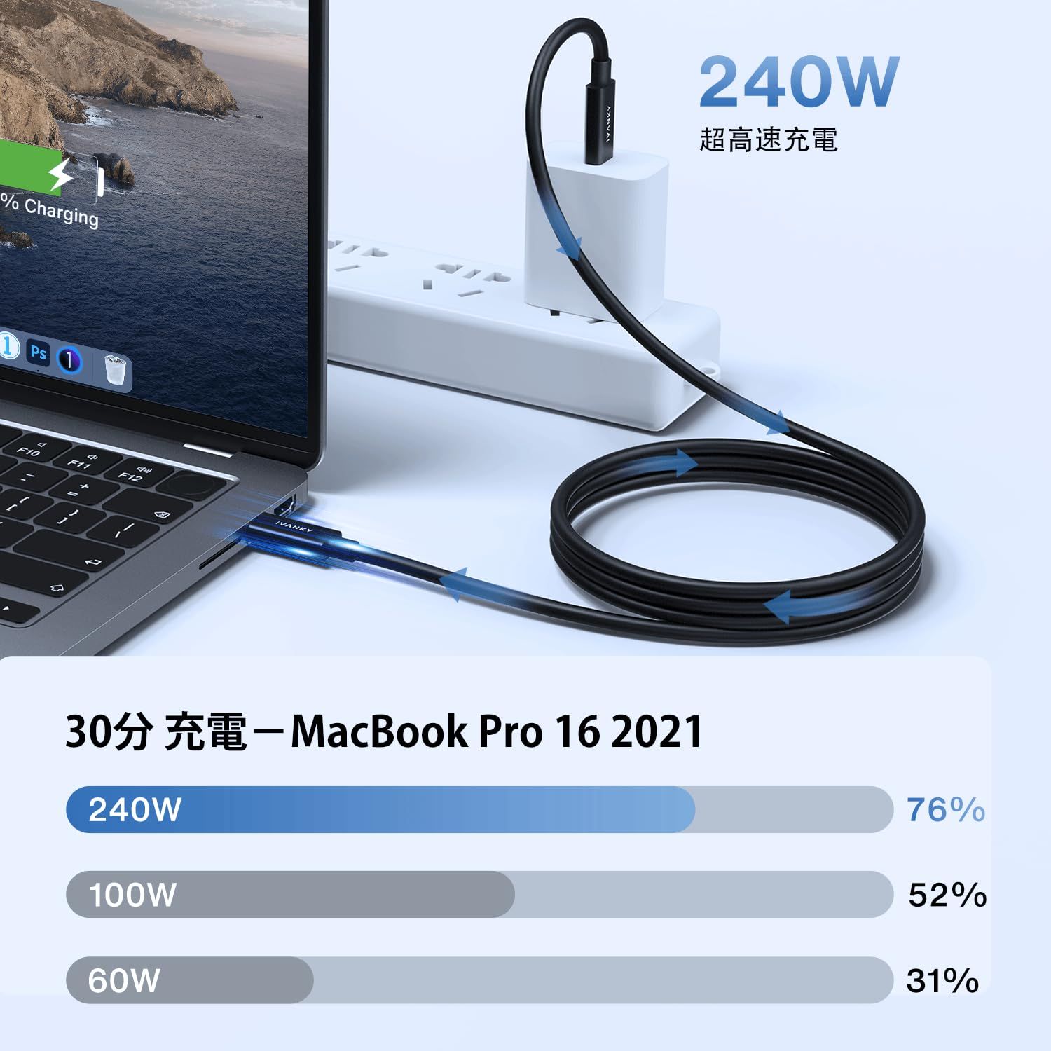 【超高速充電】240WパワーのThunderbolt 4 ケーブルで、ノートパソコンやタブレット、スマートフォンを短時間でフル充電。外出先や忙しい日常生活で、バッテリー切れの心配が減ります。