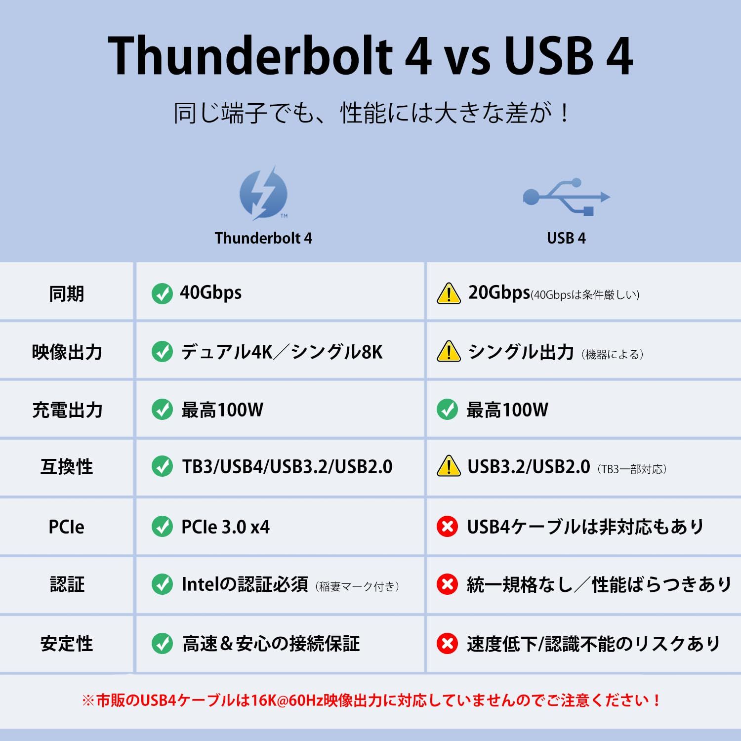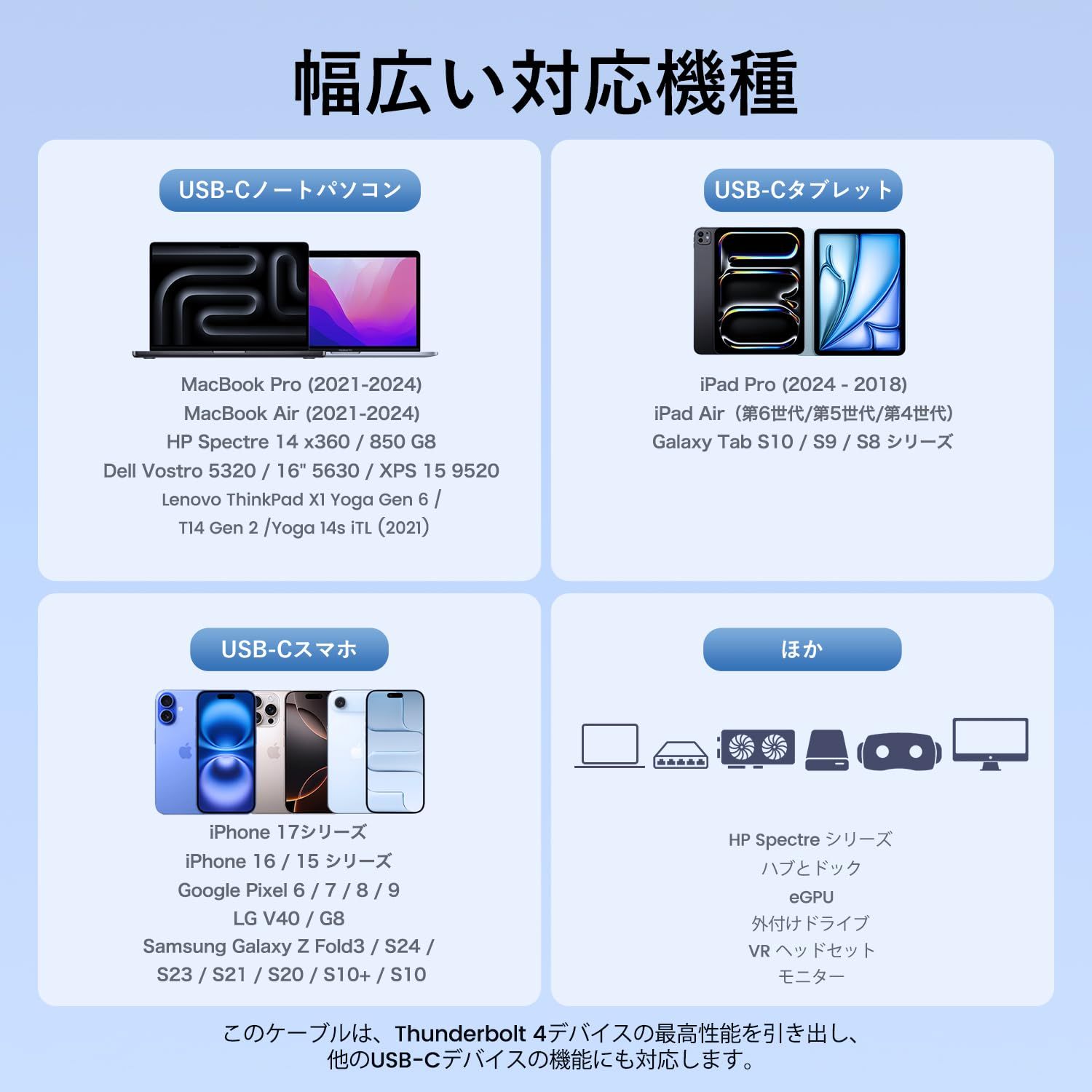 【Thunderbolt 4認証取得】このケーブルはThunderbolt 4の認証を取得しており、高い安全性と信頼性を提供します。データの転送や充電を行う際に安心して使用できるため、重要なデータを扱うプロフェッショナルにも最適です。