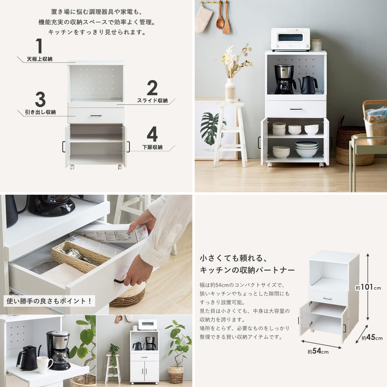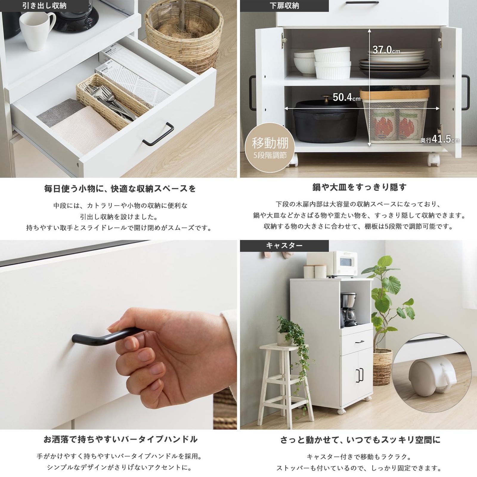 [仕様]、スライド棚付き、2口コンセント(1500W)付き、引き出し収納付き、移動棚1枚、キャスター付き、耐荷重(約):天板20kg、地板15kg、移動棚10kg、引き出し・スライド棚5kg、付属品:ネジ穴隠しシール、お客様組み立て品(組立目安時間:約60分)、生産国:ベトナム