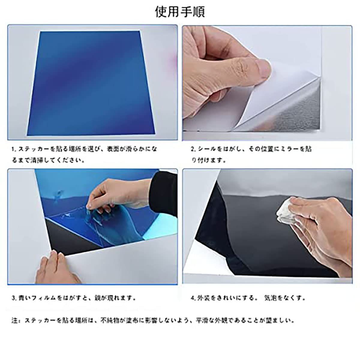【注意】ミラー表面は保護シールが付いていますので、壁などに設置した後に剥がしてください。 ※保護シールをはがした後はミラー面に触らないようにしてください(指紋の跡や傷が残る場合があります)。出来るだけ汚さないよう注意が必要です。
