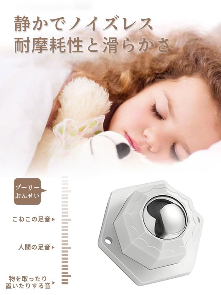 【製品特長】 ボールキャスター このキャスターは硬質ナイロン製車輪を使用しており、360度スムーズに動作します。そのため、木造の床に傷をつける心配はありません。本体はABS樹脂で作られており、耐久性に優れています。。高さに制限がある場所、奥行きがある場所、狭い場所で順調に移動し重宝するアイテムです。