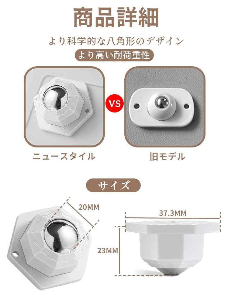 【適用場所】貼るだけキャスター このボールキャスターは、さまざまな場所で使用することができます。掃除機スタンド、収納ボックス、ゴミ箱、木の板、ラップトップ、化粧品収納、キッチン、テーブルトップ、寝室、バスルーム、リビングルーム、花棚の収納に適しています。ただし、カーペットでは使用できません。カーペットの繋ぎ目で引っ掛かる可能性があるためです。