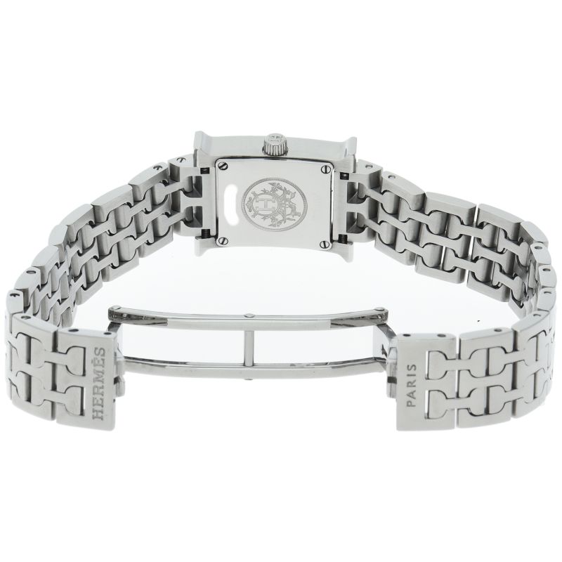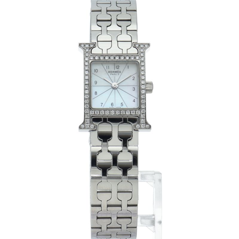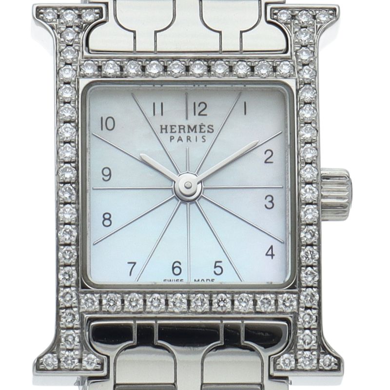商品説明:エルメスの頭文字である“H”をモチーフにしてデザインされた“Hウォッチ”。 ケースは腕にフィットするよう緩やかなカーブを描いており、着け心地は抜群です。ベゼルにダイヤモンドを贅沢に敷き詰め、エレガントで味わいのあるデザインに仕上がっています。