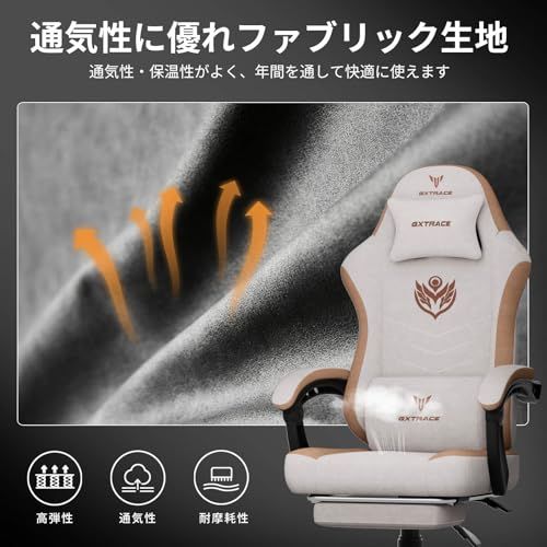【ファブリック素材で肌になじむ】椅子表面にはやわらかい肌ざわりファブリック素材を採用。布生地は、夏の涼しさと冬の温もりを、自然に調節します。柔らかな手触りが心地よく、触れた瞬間の冷たい感触もなく、特に若い冷え性女性に優しい、自然と座りたくなるやすらぎ感が魅力です。ファブリック素材が通気するため、「じっとり」「べたつき」が少なく、ゲームチェアが一年中快適な肌触りを持続します。長期間の使用や摩擦による椅子張り地の色あせが少ないため、いつまでも清潔で新しい印象を保ちます。