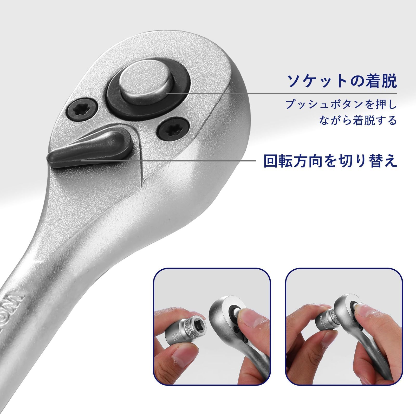 【こだわりの特徴】ラチェットハンドルはクイックリリースのデザインで、ボタンを押すだけでソケットを簡単に着脱できます。72山ギアを採用しており、細やかな動きが可能で狭い場所での作業性は抜群です。作業中によく使われるソケットサイズを揃い、一つのセットでいろんな場面に対応できます。