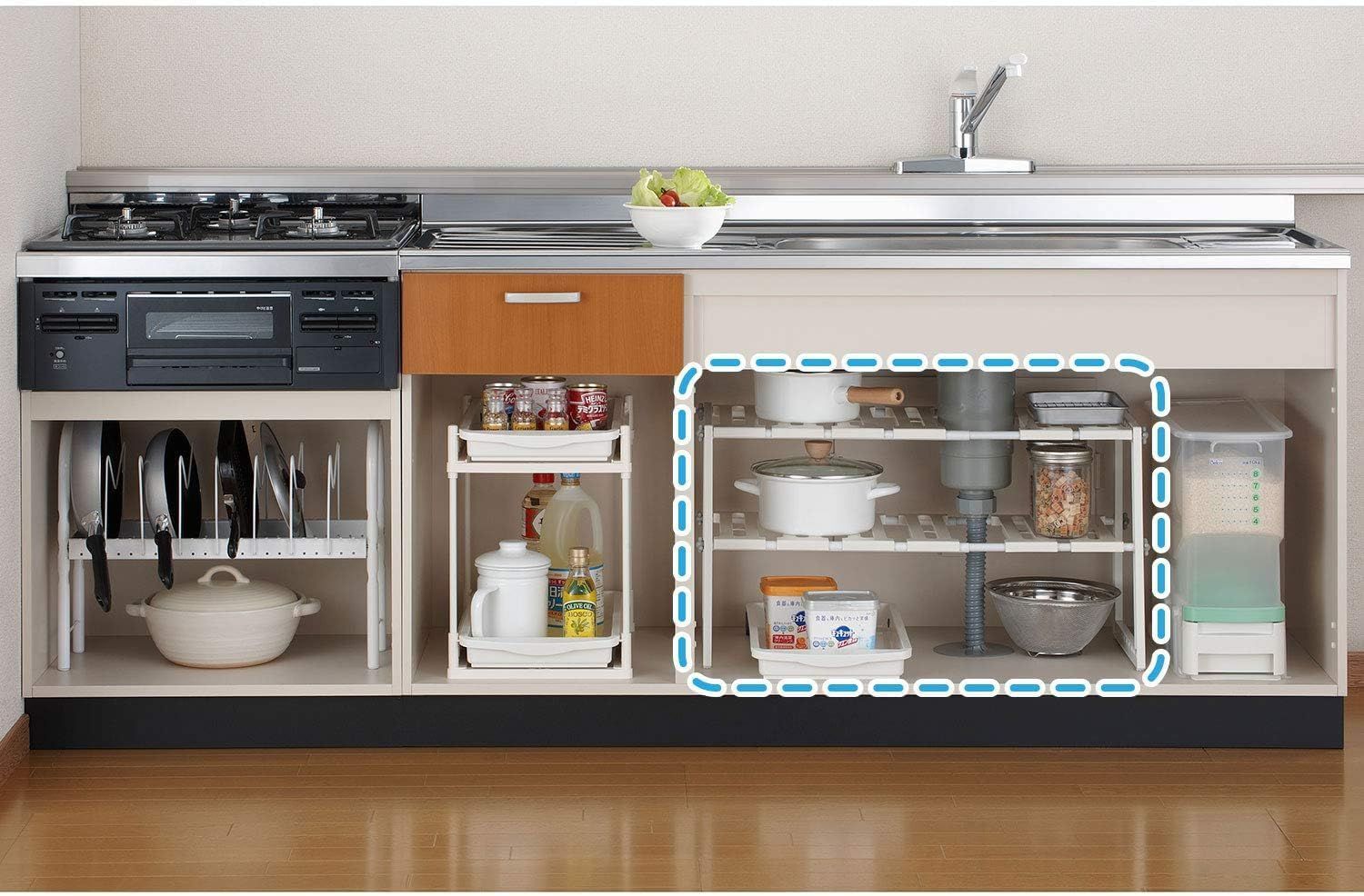 シンク下のサイズに合わせて幅50~75cmの間で伸縮することができ、棚の高さも3cm間隔でスペースに合わせて調節できます。