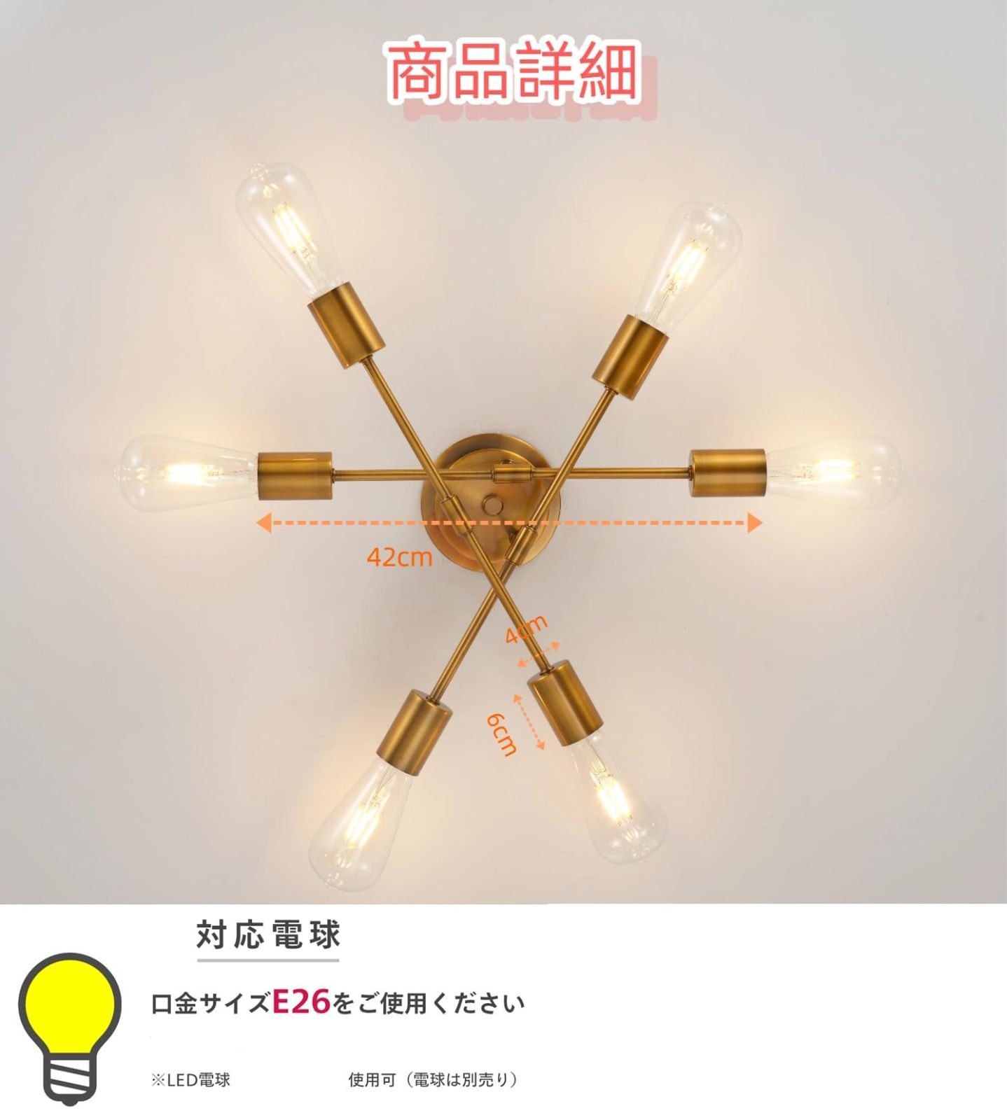 ペンダントライト アンティーク レトロ モダン おしゃれ 北欧風 シーリングライト 6灯 照明器具 ゴールド ダイニング 食卓用 リビング 居間用 寝室 LED対応 6畳 8畳 E26(電球別売り)工事不要 引掛け式 明るい 大きめ 工事不要